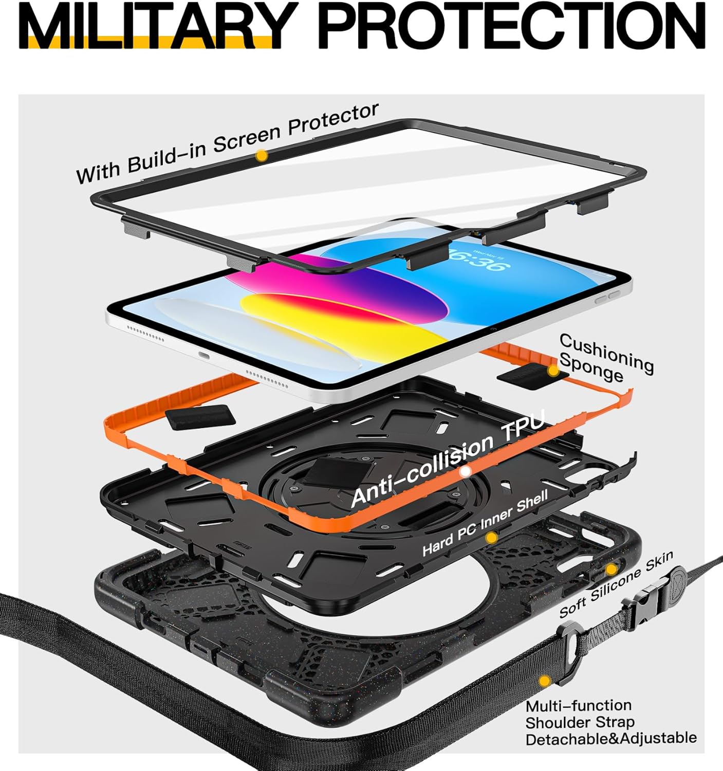 BRAECN for iPad (A16) 11th/10th Generation case 11/10.9 inch 2025/2022 Heavy Duty Shockproof Protective with Pencil Holder Screen Protector 360°Rotating Stand Handle & Shoulder Strap Full Body Cover