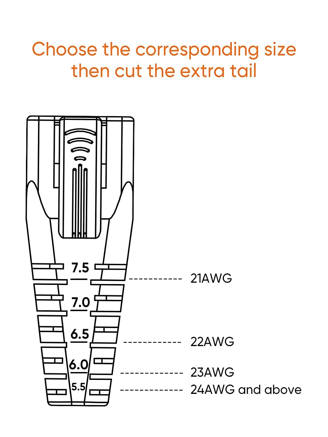 - For patch cable OD 5.5~7.5mm( fits 21AWG/22AWG/23AWG/24AWG and above), according to size mark on RJ45 network cable boot cover, you can choose the length you need