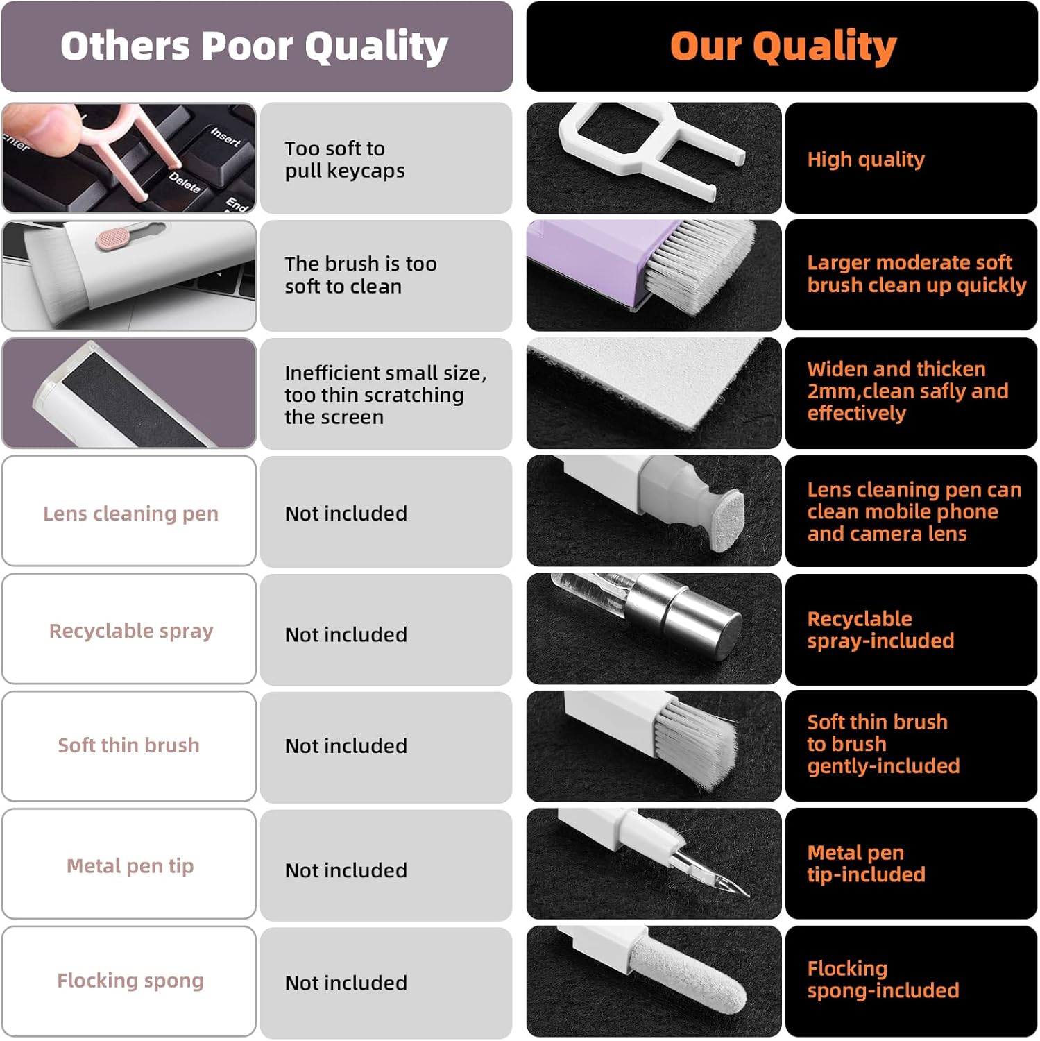 - DEEP CLEAN YOUR DEVICE The electronics cleaner kit can effectively deep clean all your electronic devices such as mobile phones, tablets, TVs, etc. It comes with retractable large brush, polishing cleaning cloth X 2, keycap puller, metal pen tip, flocking sponge, thin soft brush, soft plastic lens cleaning pen, 5 replacing cloth , large cleaning microfiber cloth. It's compact so you can keep one in a drawer, one in the car or in your bag