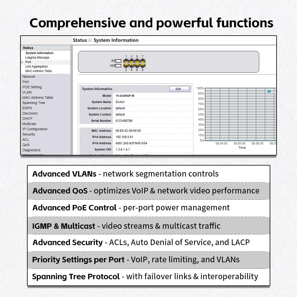 - Full gigabit 10 ports ethernet switch: 8× PoE+ (802.3at/af) 10/100/1000 Mbps RJ45 ports providing up to 30W per port and total PoE power budget of 120W, 2 SFP slots.