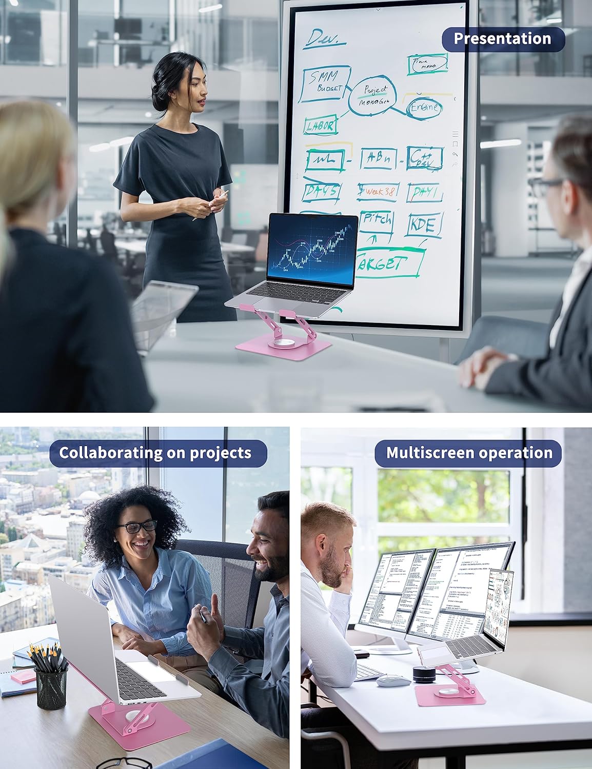 SOUNDANCE Laptop Stand with 360° Rotating Base, Ergonomic Computer Riser for Desk, Adjutable Height Muti-Angle, Foldable Laptop Mount, Stable Metal Holder Support 10-15.6" Notebook PC, Pink