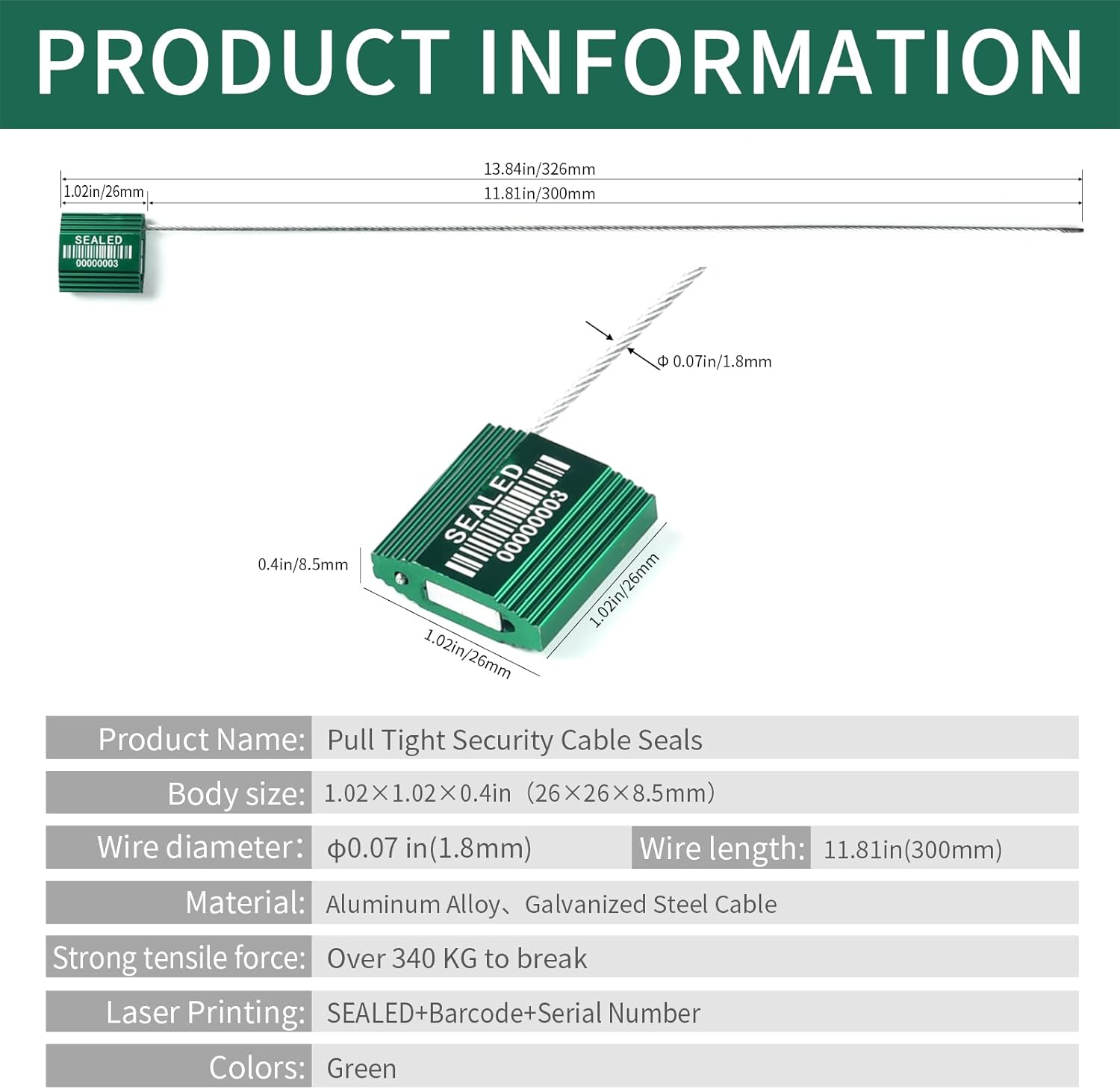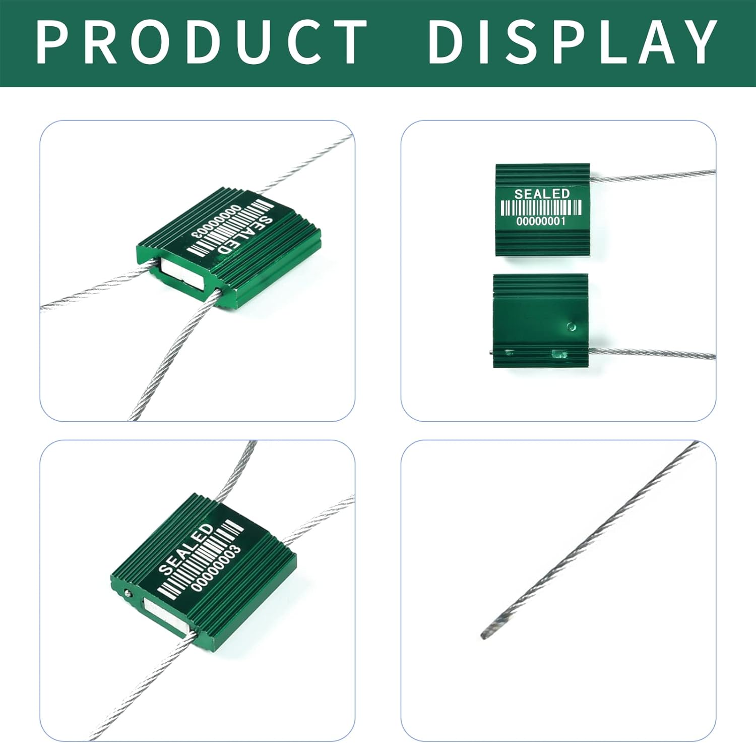 100 Green Steel Cable Seals With Barcode - High Security Numbered Truck Anti-Tamper Pull Tite Tags - Metal Container Shipping Self-Locking Safety Ties ISO 17712
