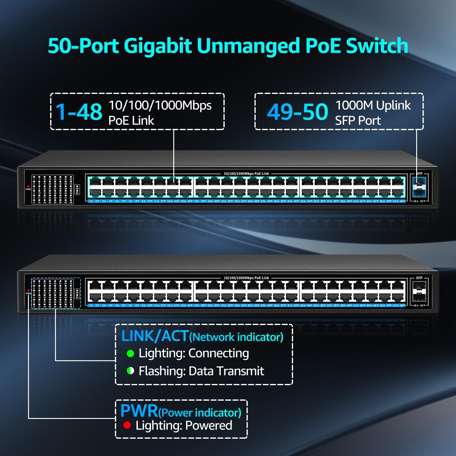 - 48-port Gigabit PoE+ switch with 48 PoE+ 10/100/1000 Mbps RJ45 ports, 2 Gigabit uplink SFP ports. SFP ports can provide more bandwidth and connect different devices such as routers, NVRs, etc.