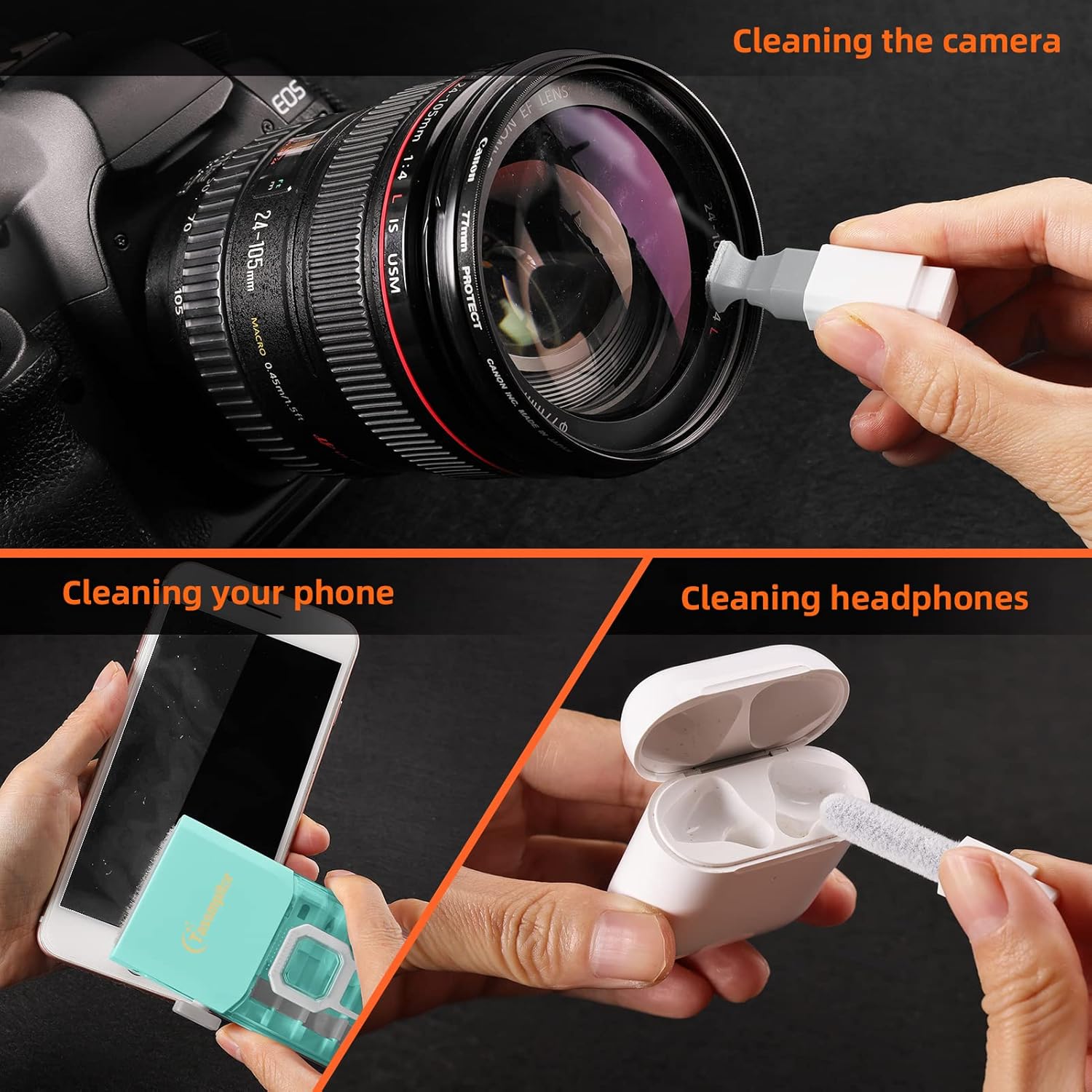 - MULTIFUNCTION IN ONE GADGET Mini soft brush and Soft plastic lens cleaning pen is especially designed for DSLR camera screen, lens and other delicate surfaces. 5 more cleaning cloth of it supplied for replacing. The flocking sponge is an excellent tool for cleaning headphones charging cases, while the metal pin tip and high-density brush are ideal for cleaning the sound outlet holes on earbuds. Keep your smartphone, camera lens, laptop, headphones and other electronic accessories clean