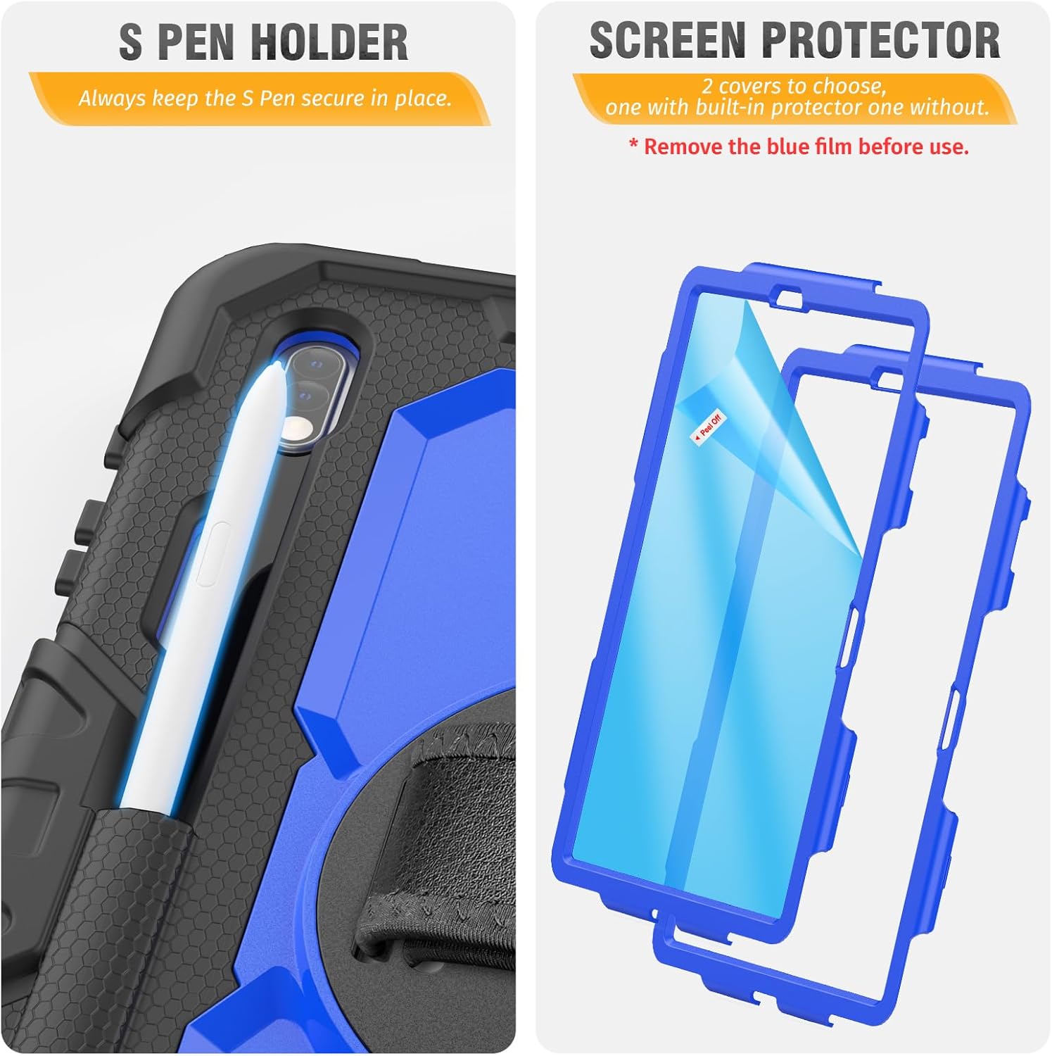 - 360 Rotating Hand Strap & Stand : With adjustable swivel hand strap and stand, you can hold the tab s7Fe 12.4 inch by one hand and find the most comfortable viewing angle you need. The built-in stand provides a stable supports, with viewing/drawing/typing angles you need, and it can be folded up when not in use.