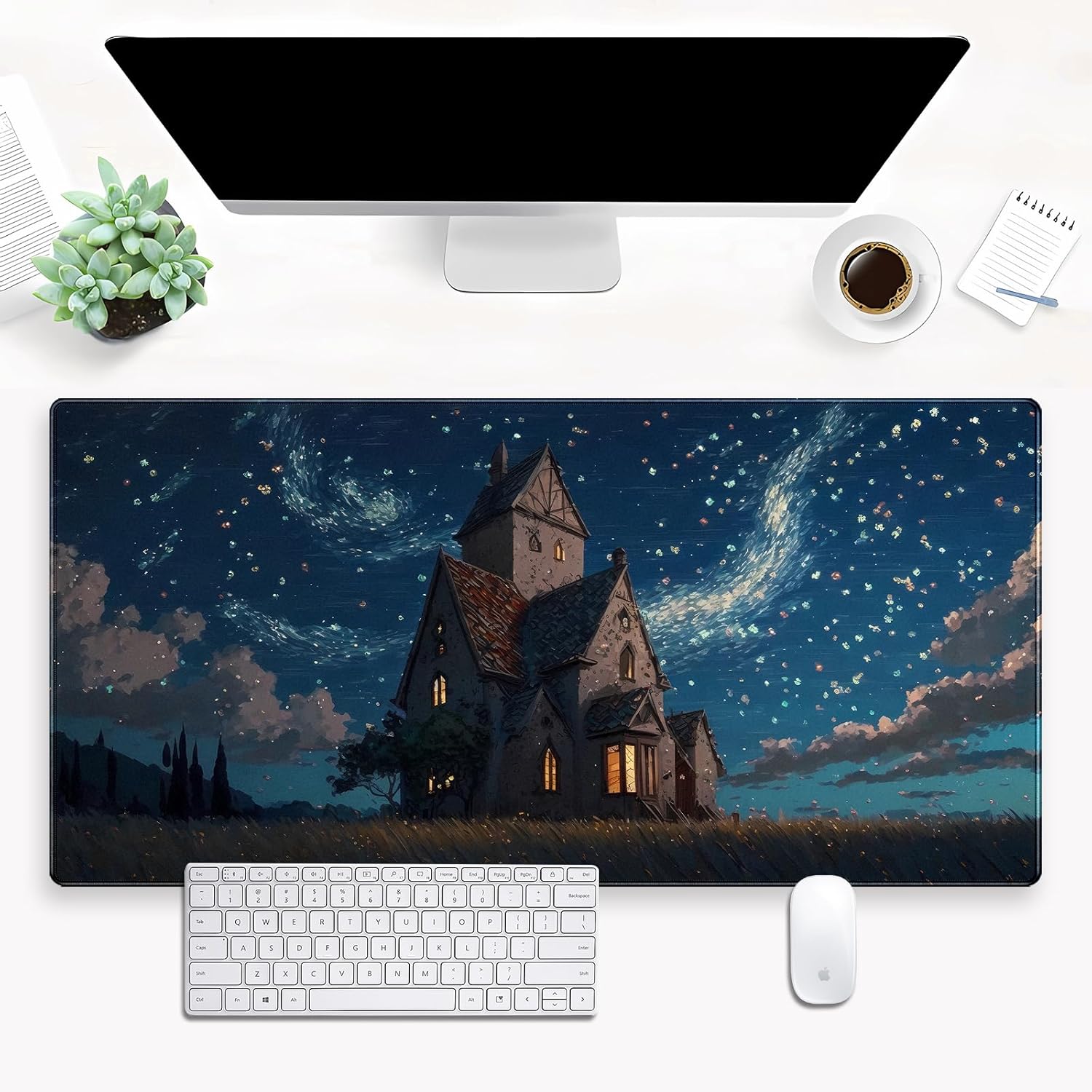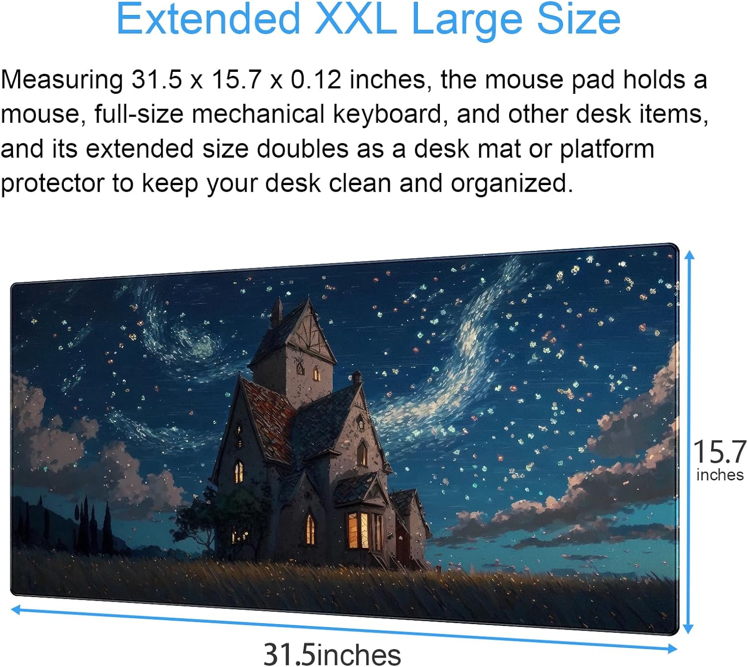Anime Art Starry Sky Castle Desk Mat - XL Large Gaming Mouse Pad with Non-Slip Base & Stitched Edges, Washable Office Decor (31.5x15.7in)