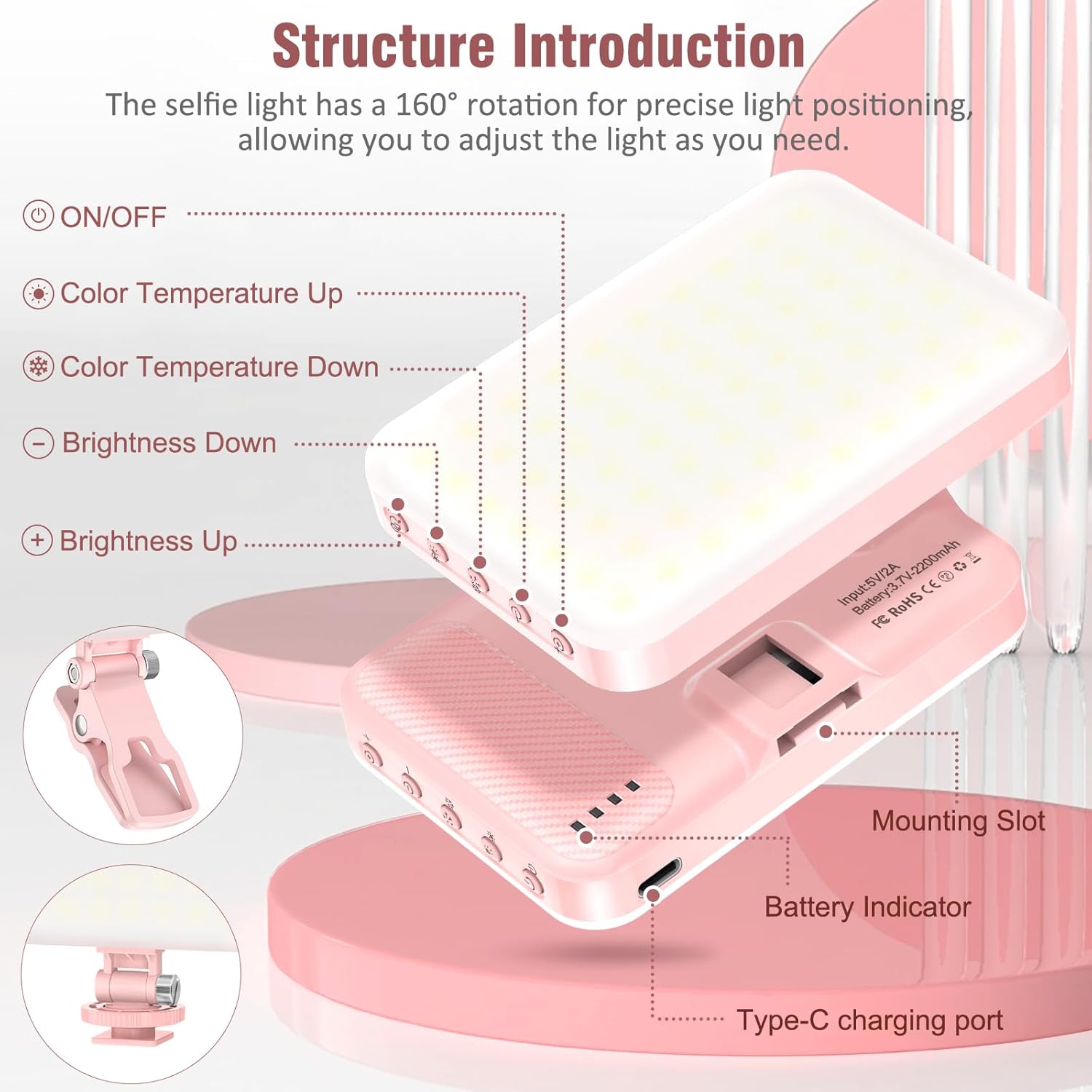 - 【Compact Pocket Size】Portable phone light clip only weighs 95g, perfectly fits in your pocket or pouch (Dimension: 3.9*2.8*0.78in). This mobile phone fill light can be a perfect gift for friends, family, colleagues, lovers who like to take selfies or post a lot of videos, I believe they will like it very much. Package Contents: 1* LED Video Light, 1* Clip, 1* USB-C Cable, 1* 1/4’’ Nut Adapter, 1* 1/4’’ Hot Shoe Mount, 1* Storage Pouch, 1* User Manual.
