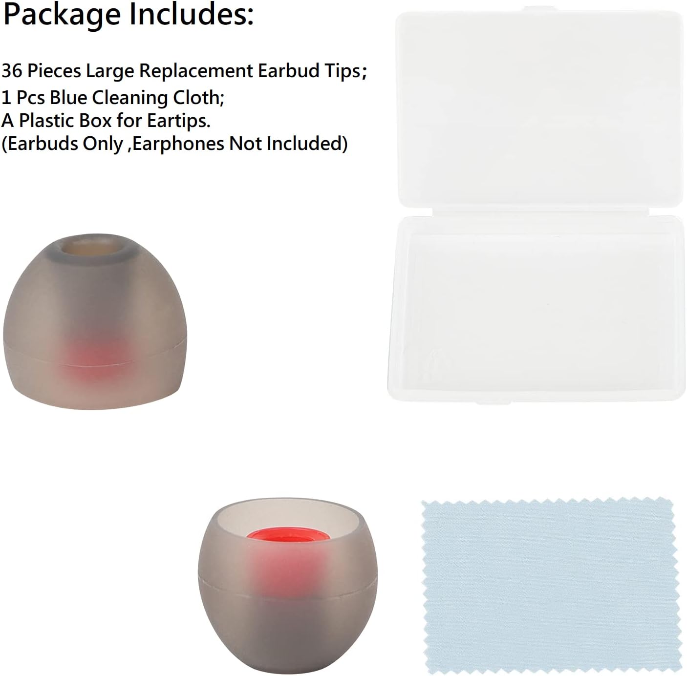 - Package Includes: 36 Pieces Large Replacement Earbud Tips;1 Pcs Blue Cleaning Cloth;A Plastic Box for Eartips.(Earbuds Only ,Earphones Not Included)