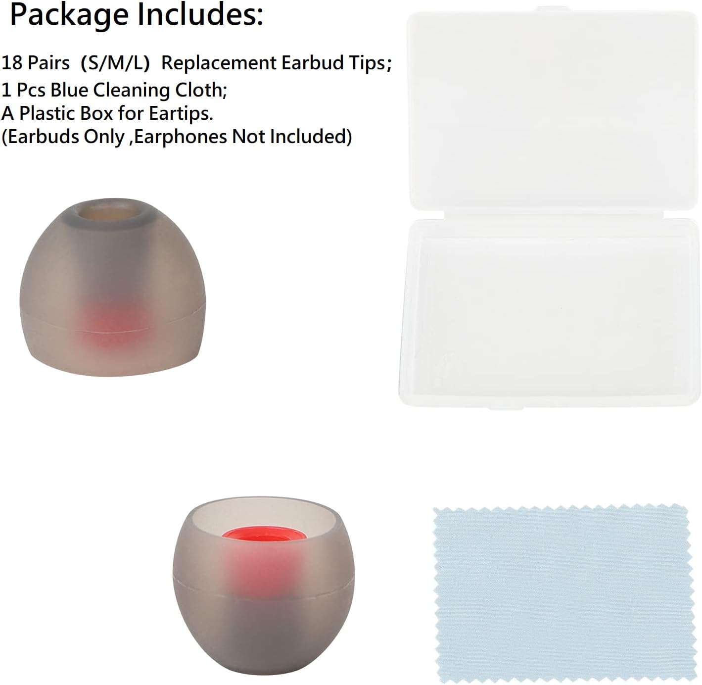 - Package Includes: 18 Pairs(S/M/L)Replacement Earbud Tips;1 Pcs Blue Cleaning Cloth;A Plastic Box for Eartips(Earbuds Only ,Earphones Not Included)