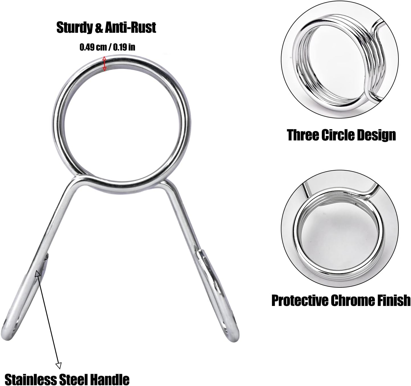 - Heavy Duty: Made of chrome-plated steel designed with 3 circle springs, the weight clips can hold weight plates in place to prevent sliding off or moving around from the barbell.