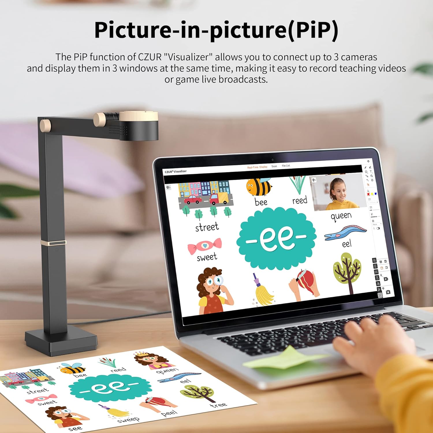 - Picture-in-picture(PiP): The PiP function of CZUR "Visualizer" allows you to connect up to 3 cameras and display them in 3 windows at the same time, making it easy to record teaching videos or game live broadcasts