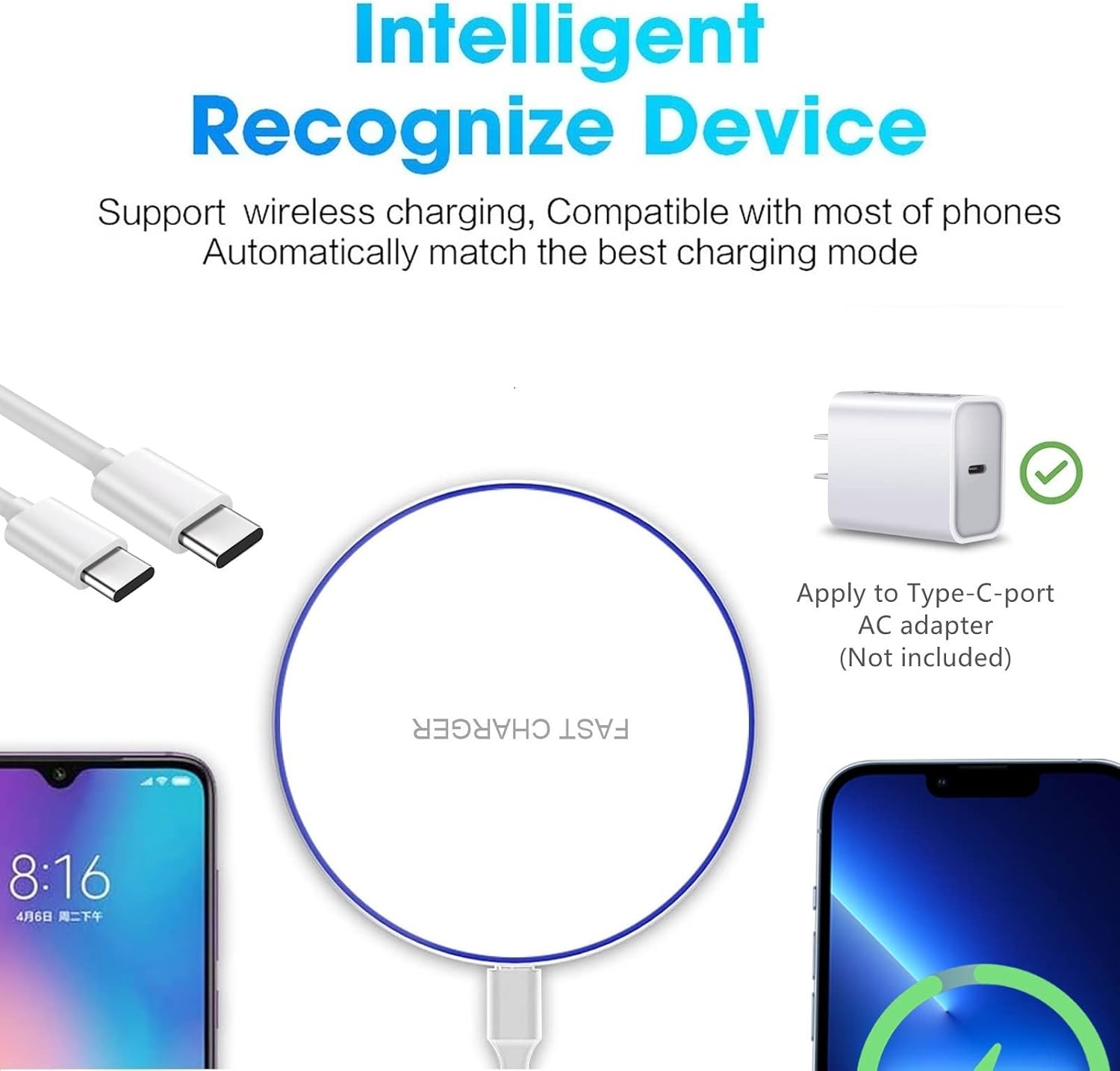 - What You Got: 1xwireless Charging Pad, 1x3.3ft USB-C to USB-C Charging Cable, 1xUser Manual, and reliable 12-hour response service & Hassle-free refund.a worry-free buying experience.zero risk purchase is for every customer's smiles. If in any way you're not 100% satisfied with your purchase, please just contact us via Email Center. We will help within 12 Hours| (No AC Adapter)