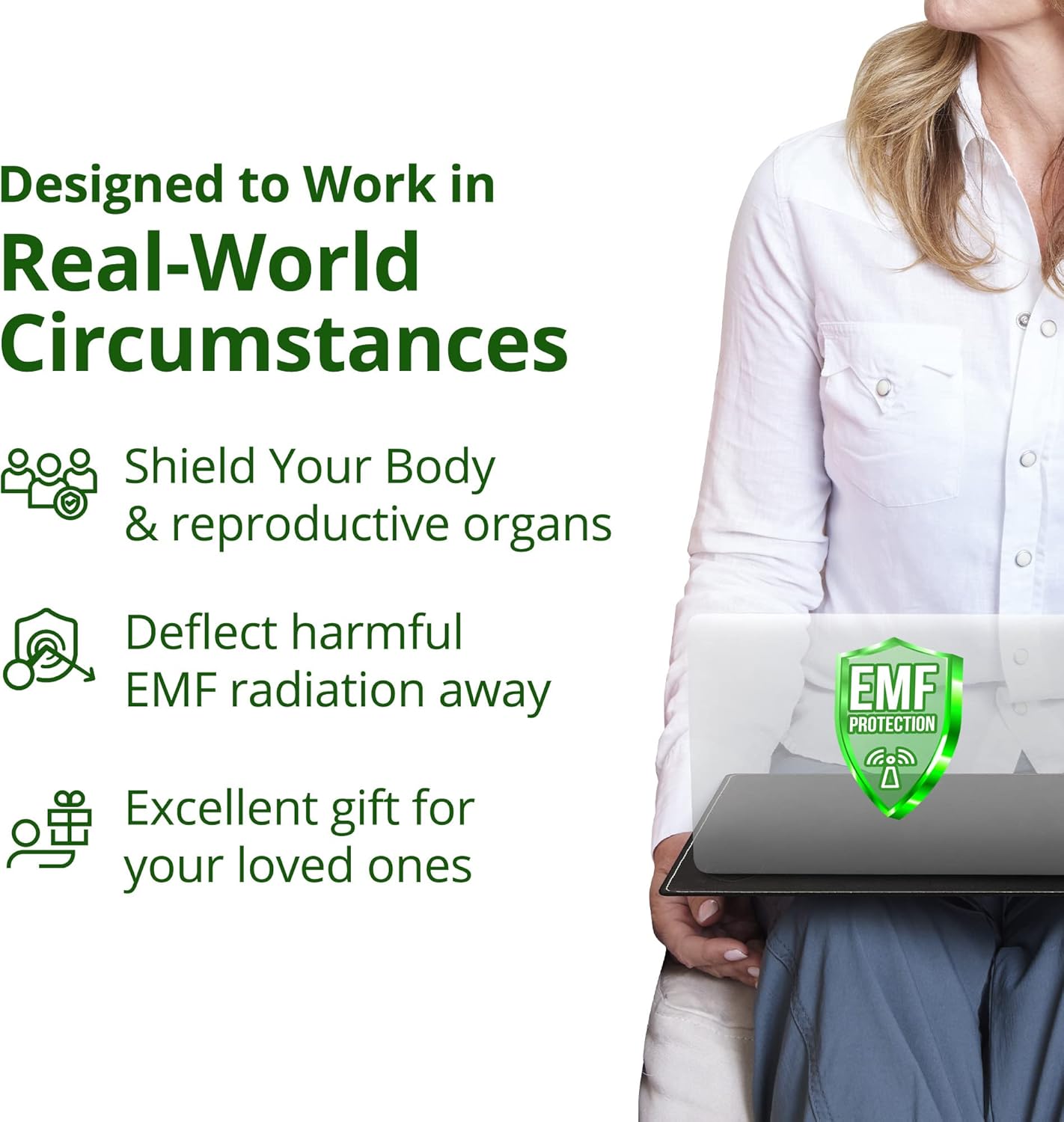 - Durable, Multi-Layer Construction - This lap pad is constructed with reinforced, vegan leather plus 2 layers of SaferBody — a polyester base woven with metallic threads. This design allows our laptop mat to cast a safe shield across your lap, covering up to 99% of EMF radiation every time!