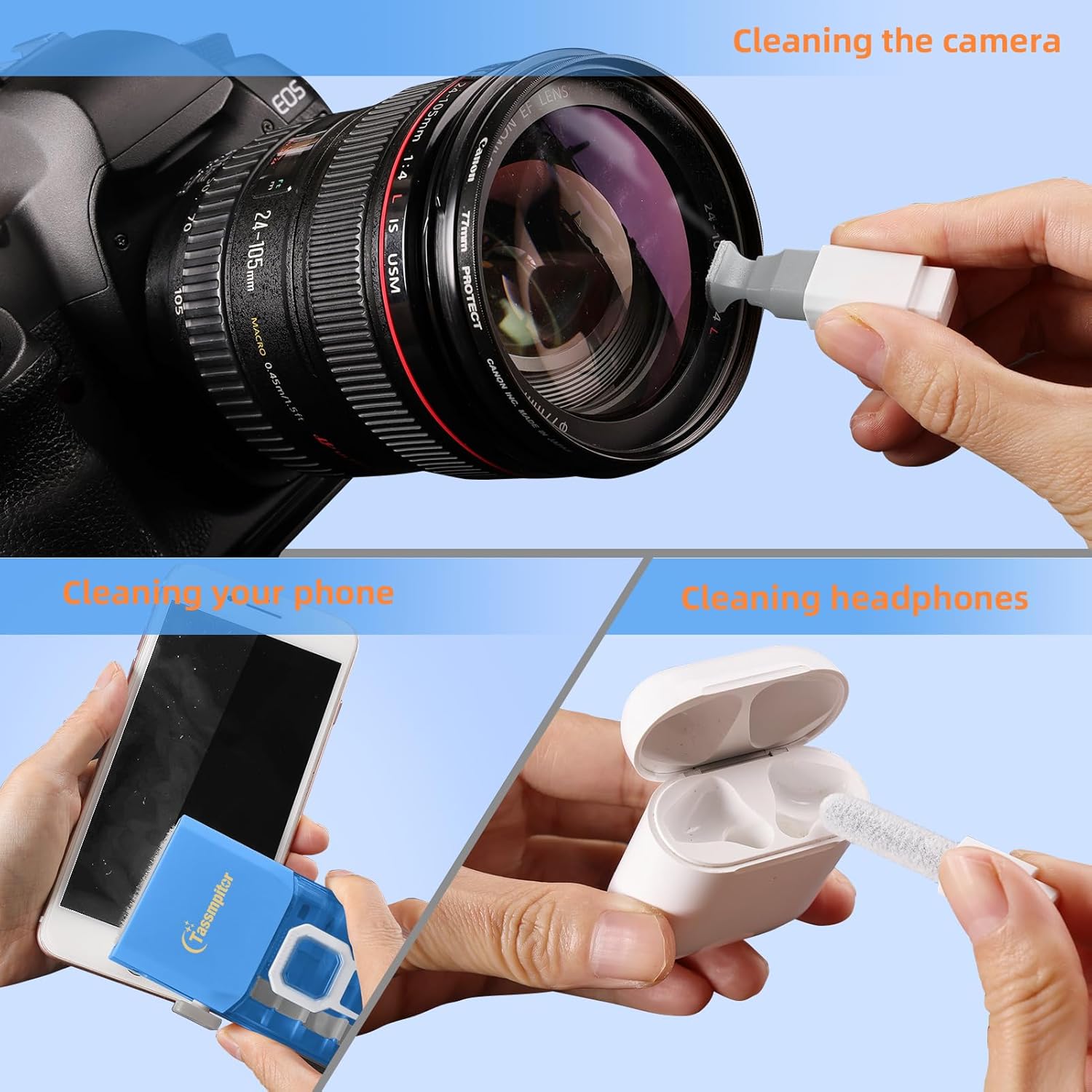 - MULTIFUNCTIONAL LAPTOP KEYBOARD CLEANER Mini soft brush and Soft plastic lens cleaning pen is especially designed for DSLR camera screen, lens and other delicate surfaces. 5 more replaceable cleaning cloth of it. The flocking sponge is an excellent tool for cleaning headphones charging cases, while the metal pin tip and high-density brush are ideal for cleaning the sound outlet holes on earbuds. Keep your smartphone, camera lens, laptop, headphones and other office electronic supplies clean