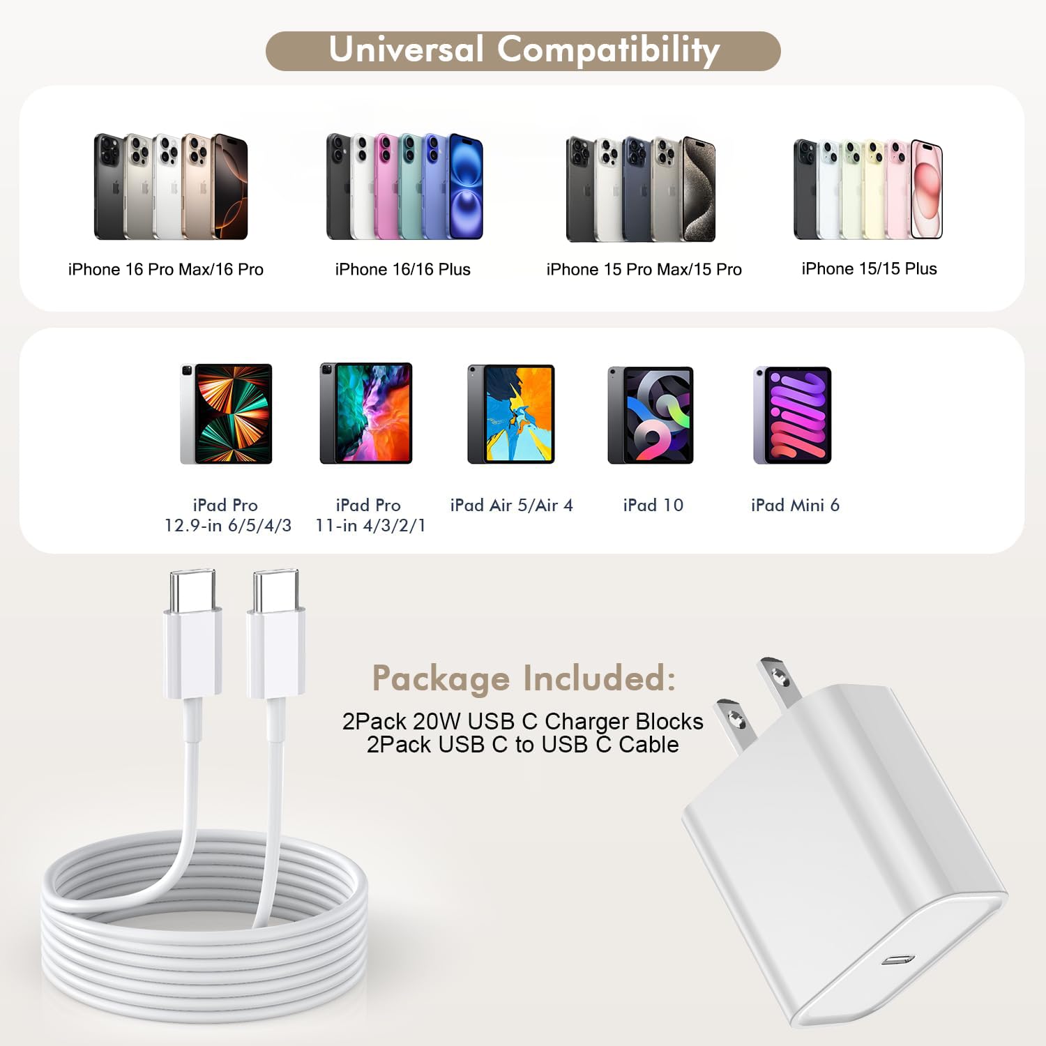 - 【What you get】 2x PD 20W iPhone 16/15 fast charger plug and 2x 10FT USB to USB C data cables. If you have any questions about the product, please feel free to consult our customer service at any time