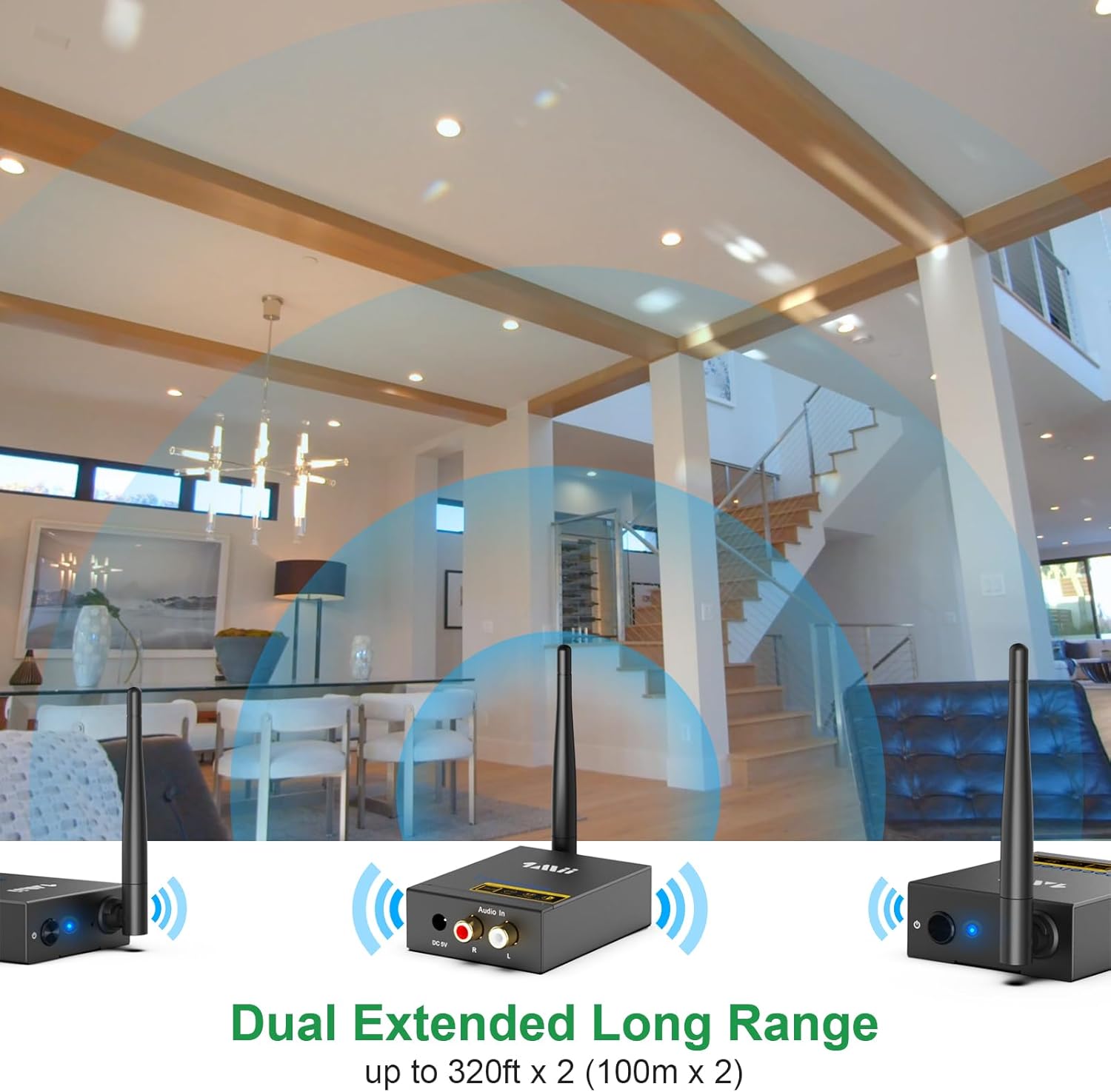 - Special Feature : 2.4Ghz Wireless Audio Transmitter and Receiver, 20ms Low Latency, 320ft Long Range Wireless Audio Adapter, HiFi Sound Quality up to 24bit/ 192kHz, Two Receivers for 2 Powered Speakers 2.4Ghz Wireless Audio Transmitter and Receiver, 20ms Low Latency, 320ft Long Range Wireless Audio Adapter, HiFi Sound Quality up to 24bit/ 192kHz, Two Receivers for 2 Poโฆ See more