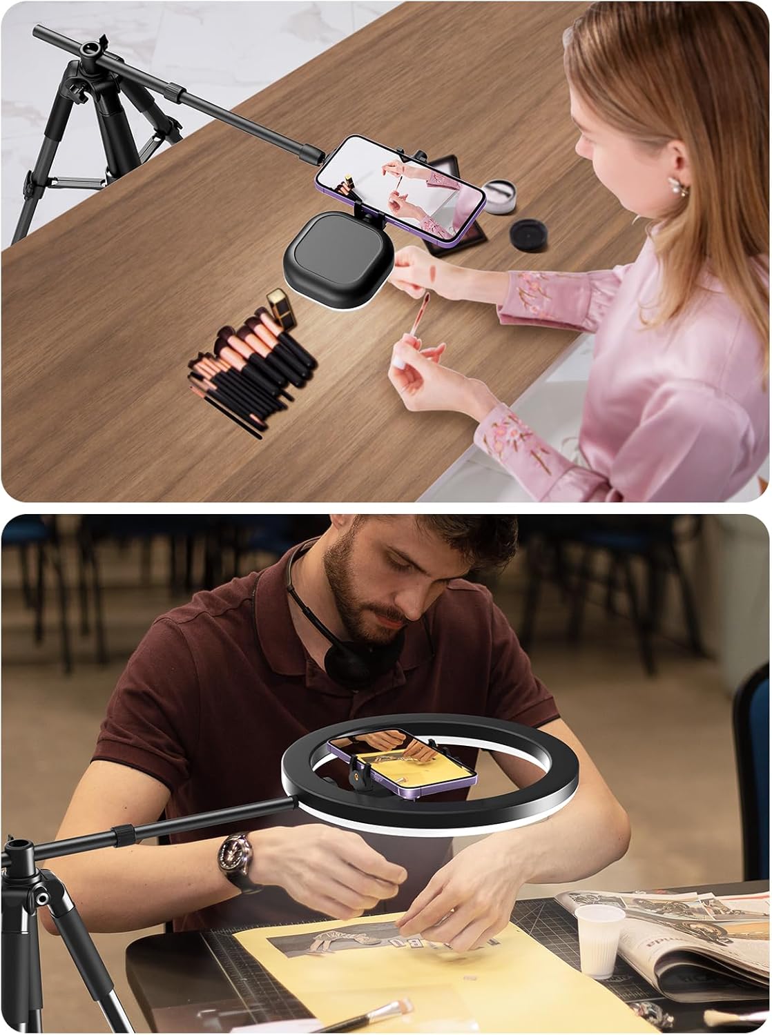- 【Compatible with More Devices】 When you are making some cooking videos or painting, you may encounter situations where the shot doesn't look good because of the lack of light. The ball head is removable so you can attach this ball head and phone holder to the ring light then connect it with the horizontal arm to realize the combination of the fill light and the overhead phone mount stand. It's much useful for Cooking, Baking, Crafting, Drawing, Nail Art, Tattoo etc.