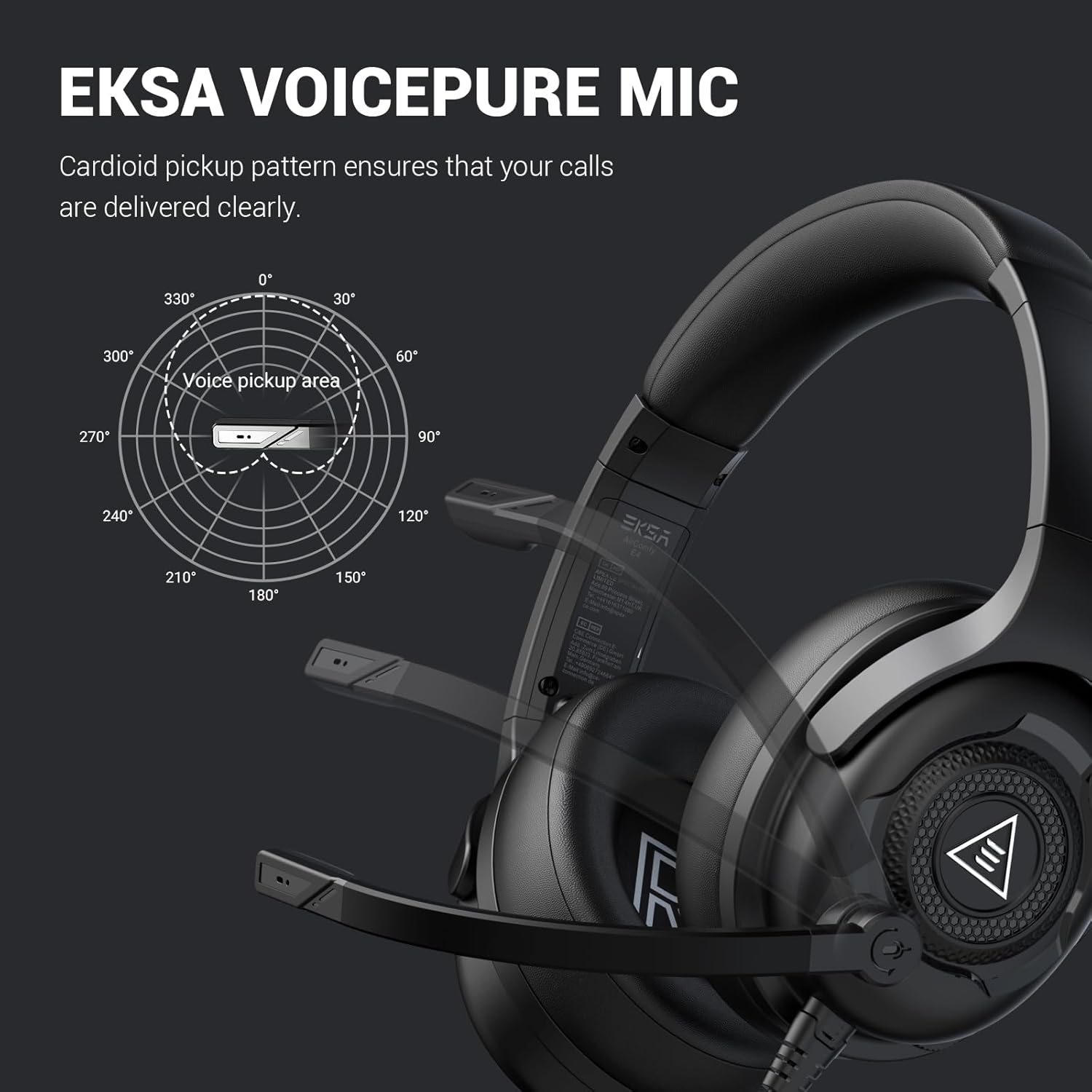 - [Noise Cancelling Microphone] EKSA laptop headphones, features an adjustable high-quality cardioid microphone that provides excellent voice team communication by picking up clear sounds from your mouth region while minimizing unwanted background noise from the back and sides, combined with over ear noise isolation earmuffs, ensuring crystal-clear sound.