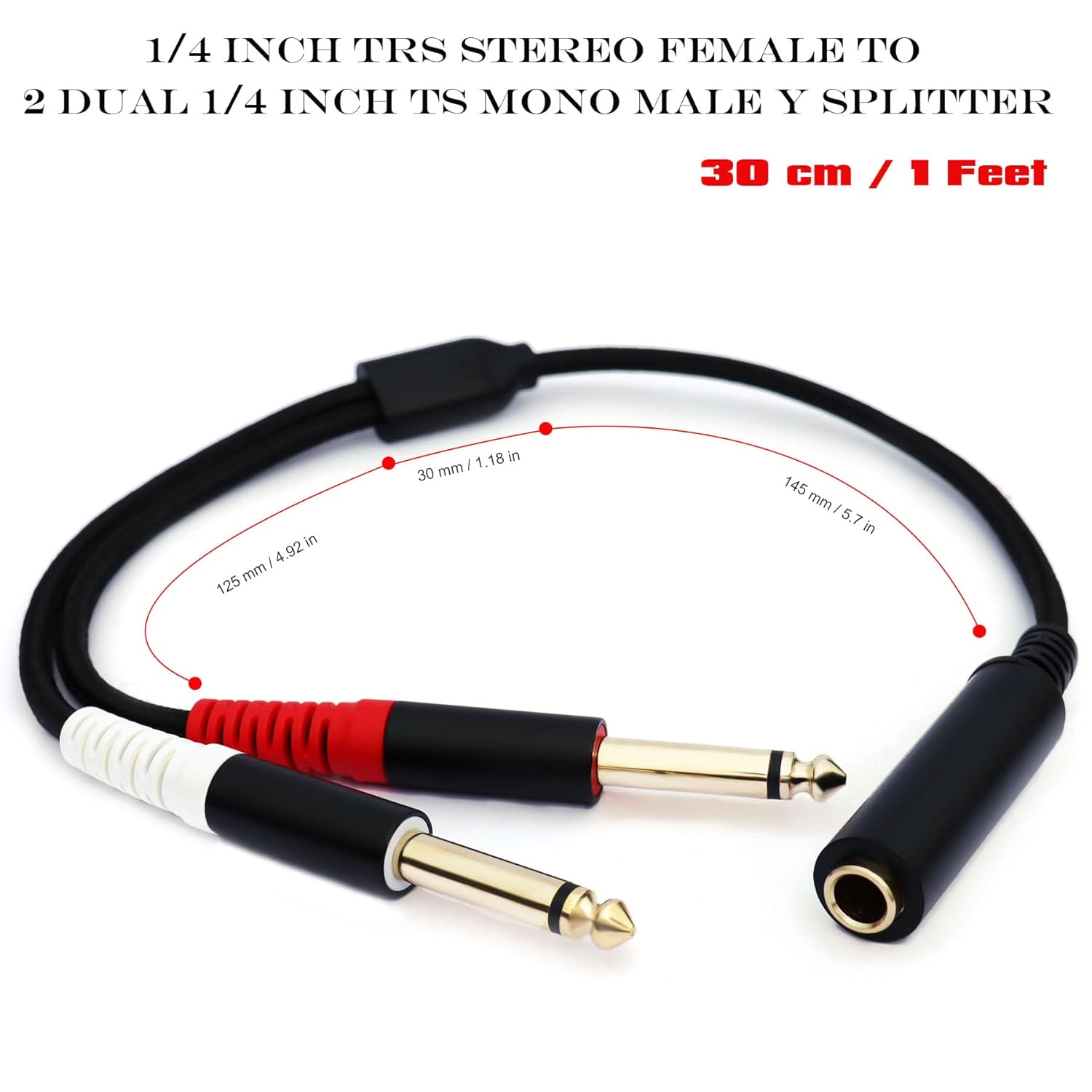 1/4 TRS Female to Dual 1/4 TS Y Splitter Cable Adapter, 1/4" Female TRS to Dual 6.35mm TS Male Adapter, 6.35mm 1/4 Inch Female to Two 6.35mm 1/4 inch TS Stereo Breakout Cable - 1 ft