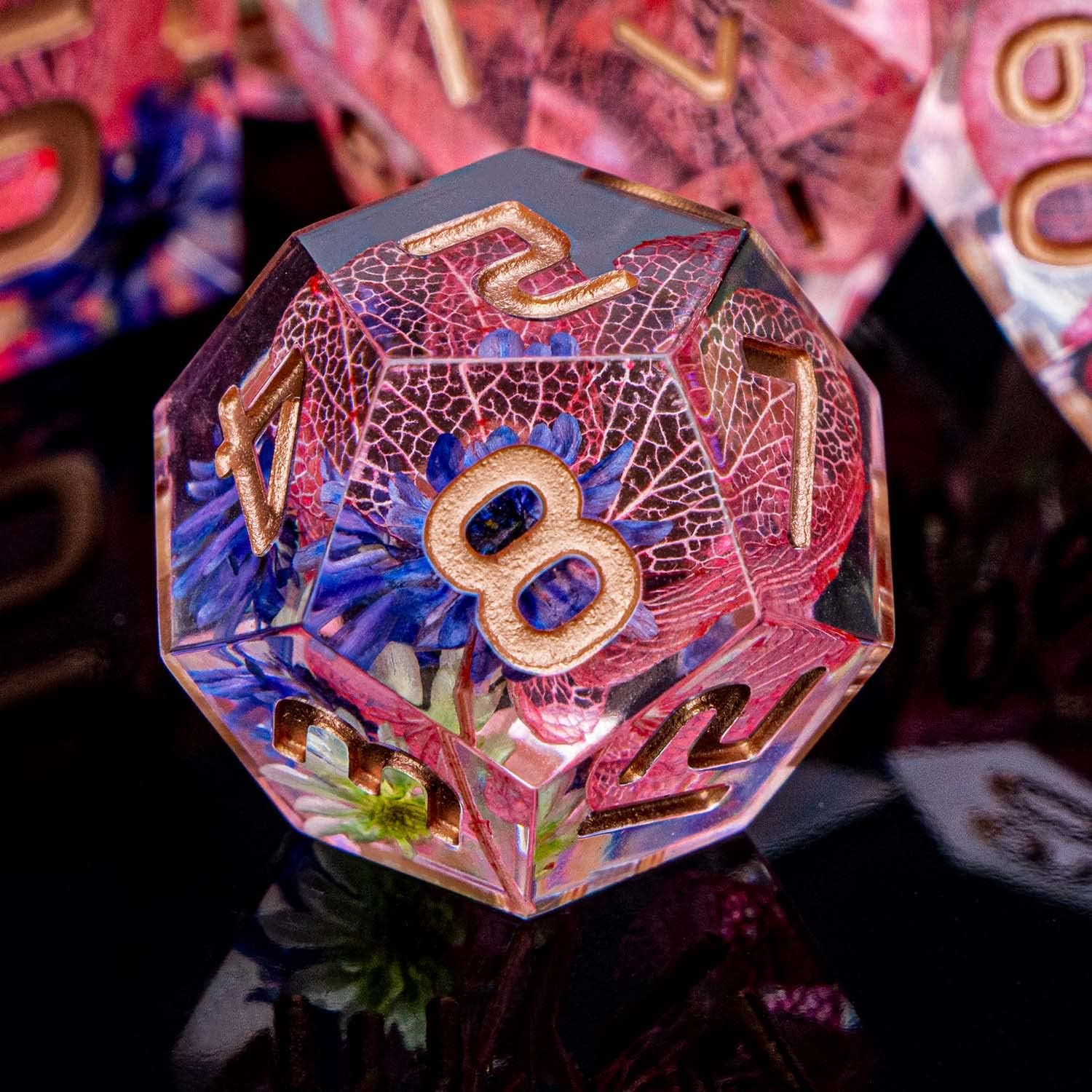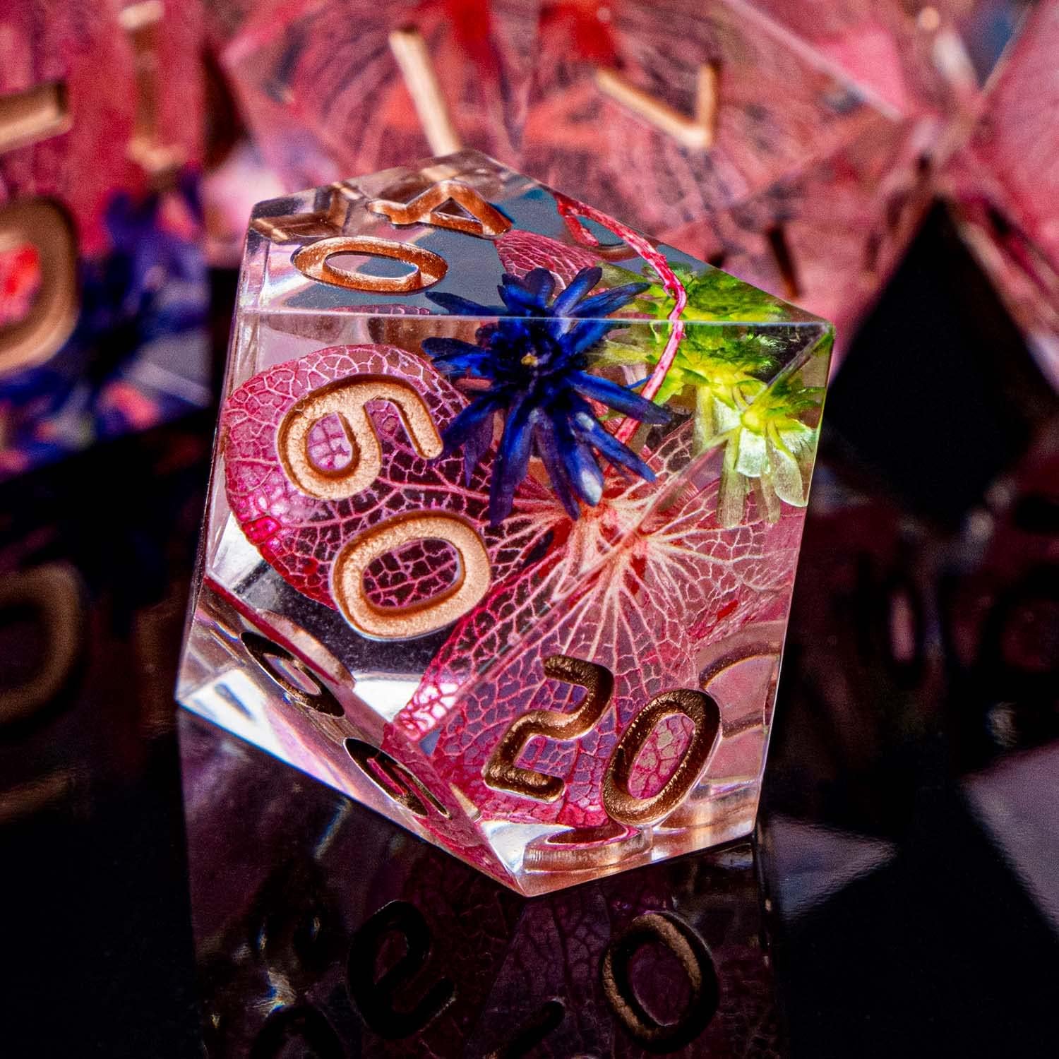 ARUOHHA DND Resin Dice Translucent Pink Leaf Sharp Edged Dragons Dice Set with Box, 7pcs Flower Inclusions Polyhedral Dungeons D and D Dice RPG Role Playing Game D20 D12 D10 D8 D6 D4