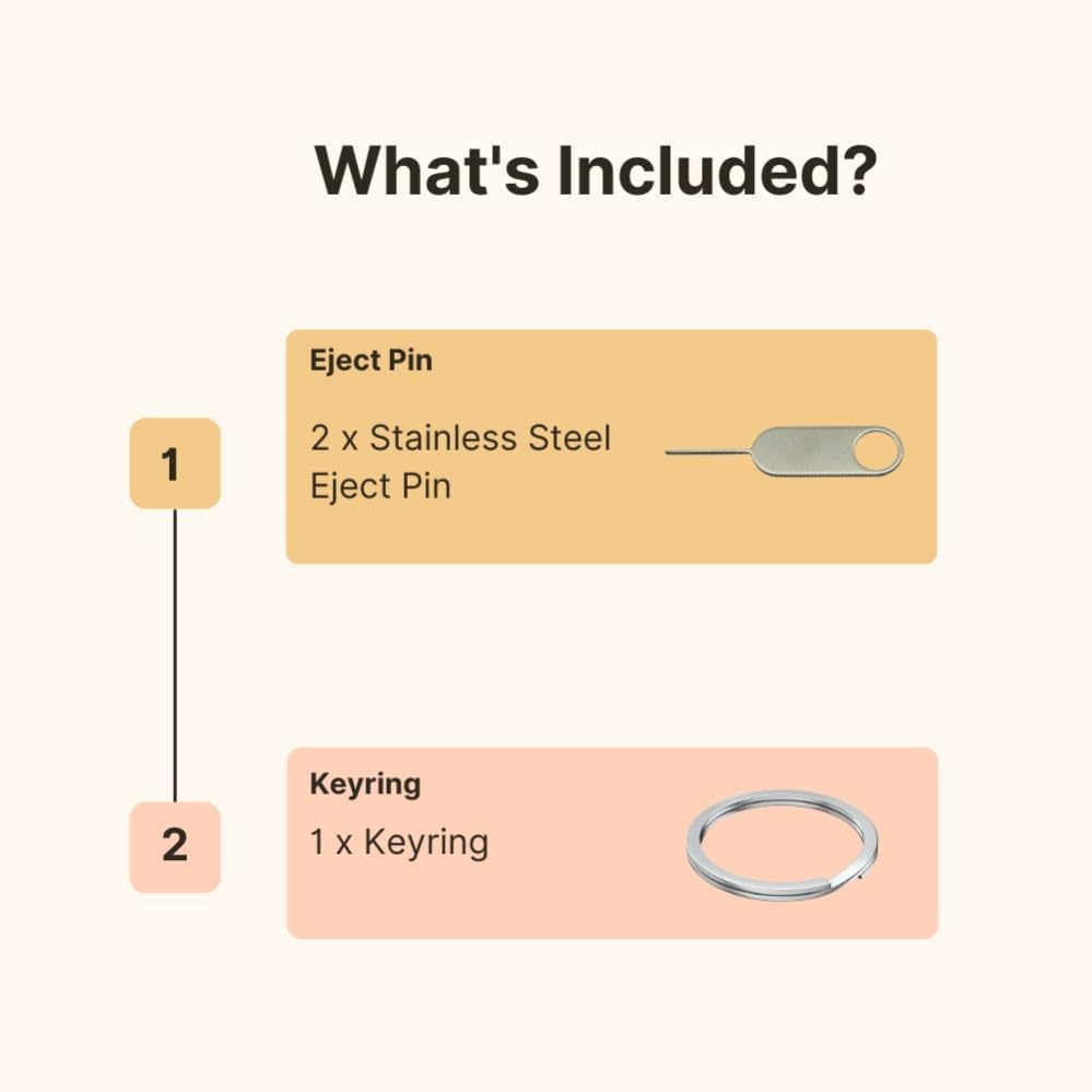- Contents: Sim Tray Eject Pin x 2, Keyring x 1