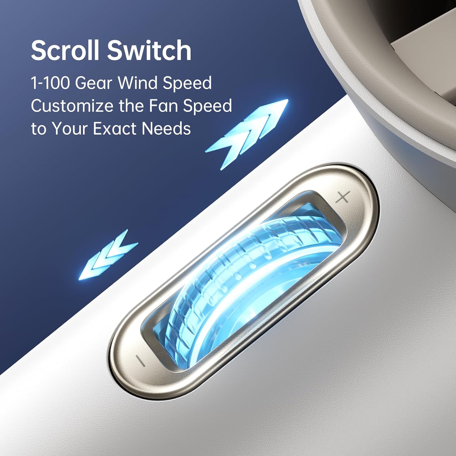 - Scroll Switch - Customizable Wind Speed: This small fan adopts a scroll switch design, and the wind speed can be adjusted steplessly. The portable fan can customize speeds from 1 to 100, meeting your various wind power needs in any scene