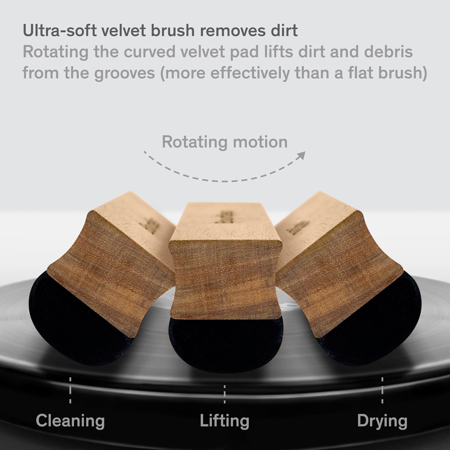 - Ultra-soft velvet vinyl brush & cleaning solution remove dirt — Rotating the curved, non-scratching velvet surface of our record cleaner brush effectively lifts dirt and debris from the record grooves (compared to a flat record cleaning brush which can push it back in). Our record cleaner fluid penetrates the grooves to extract built-up grime, dust and fingerprints, while never harming the vinyl surface.