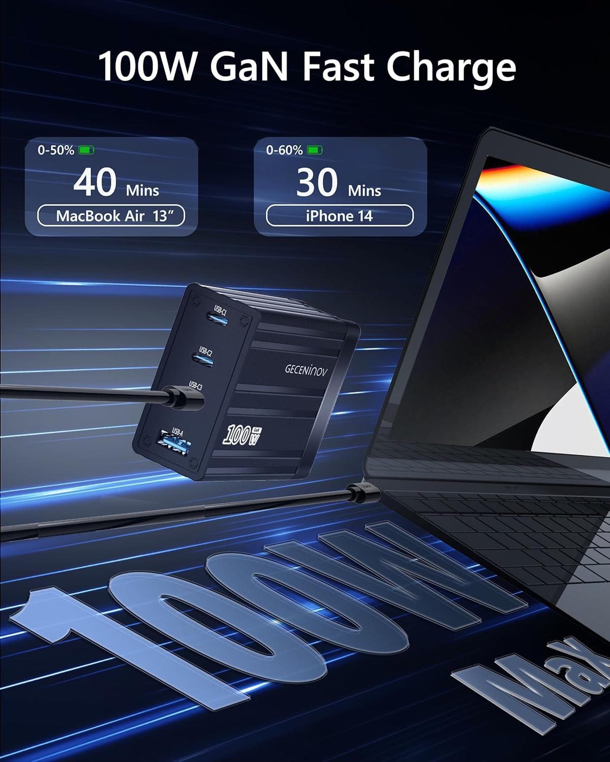 - ✅【3 x Fast Charging Speed】The GaN fast charger Built-in with advanced GaN technology, this type c charger block delivers up to 3 times faster charging speed than traditional usb-c charger.100W usb c charger takes just 40 minutes to charge a 13-inch MacBook Air from 0% to 50%, and just 30 minutes to charge an iPhone 14 from 0% to 60%.