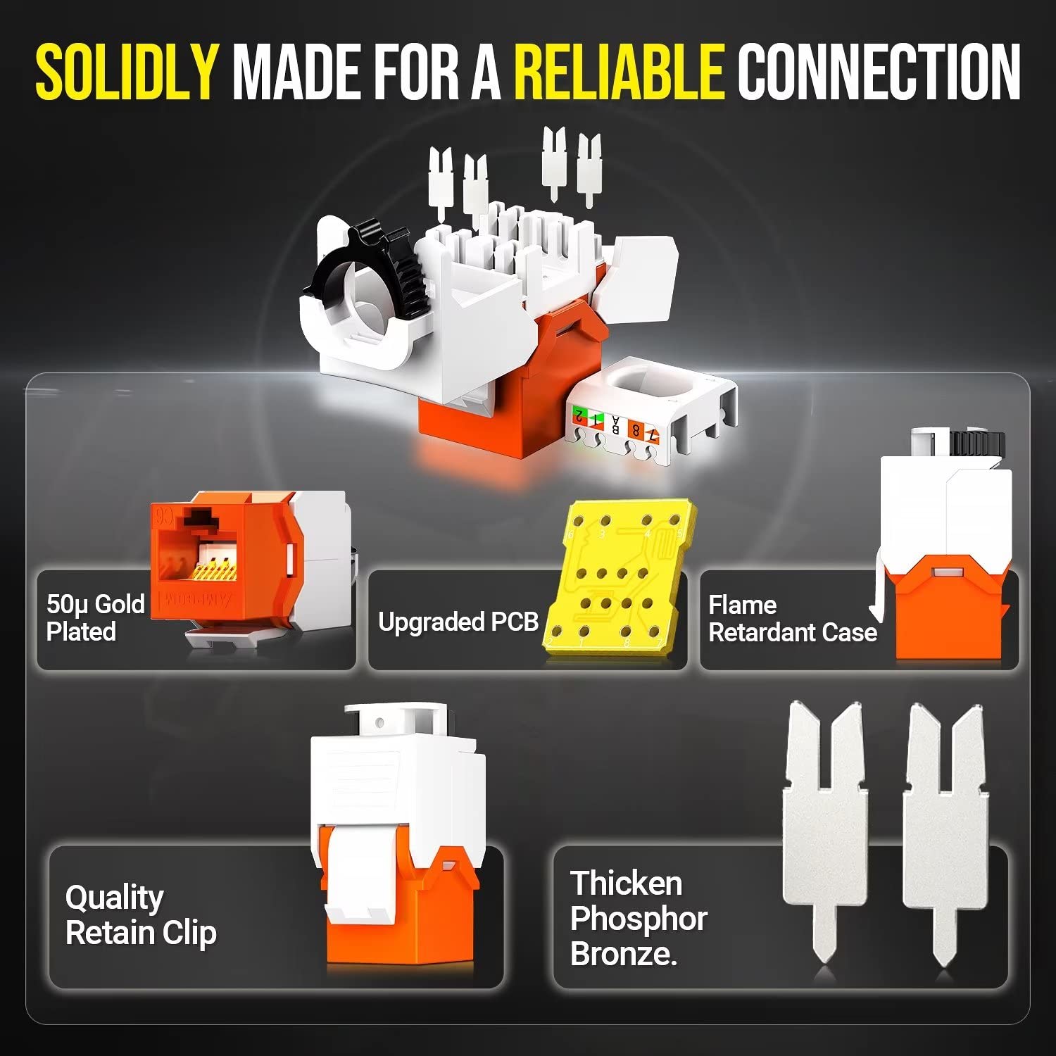 AMPCOM CAT6 RJ45 Keystone Jack - Reusable UTP Ethernet Wall Jack with Adjustable Ratchet Lock Design, No Tool and Zip Tie Required - 50u Gold Plated - Orange (2-Pack)