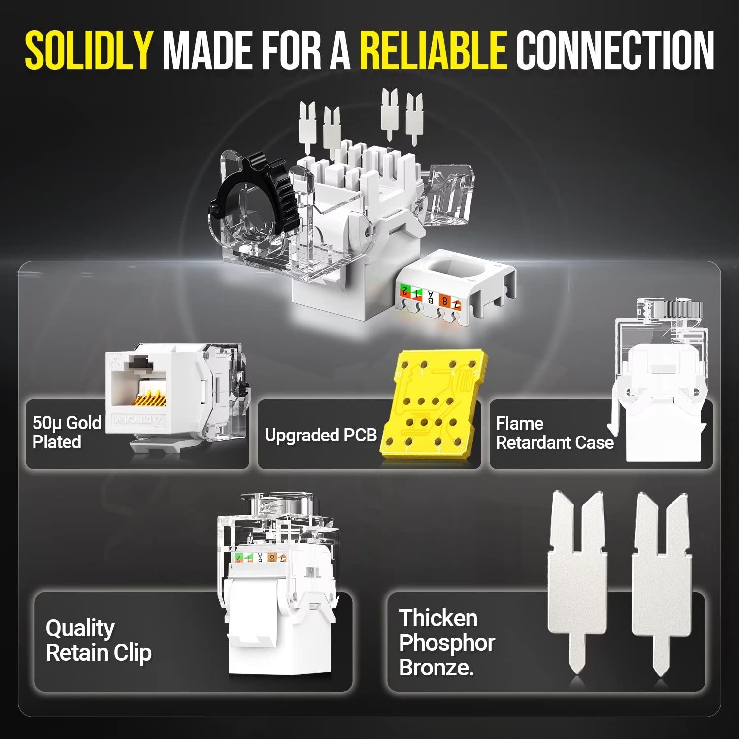 AMPCOM CAT6A UTP RJ45 Keystone Jack 50u Gold Plating Reusable Ethernet Wall Jack with Adjustable Ratchet Lock (No Tool and Zip Tie Required) - White (12-Pack)