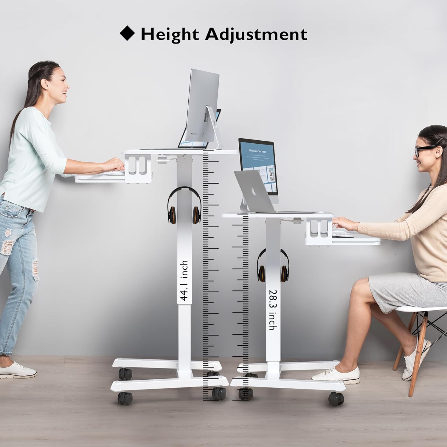 - ADJUSTABLE HEIGHT DESIGN: The mobile standing desk promotes a healthier workstyle by allowing quick transitions between sitting and standing. The gas spring lift smoothly adjusts the height from 28.3in to 44in, supporting better posture and reducing neck and back strain during long working hours. This portable desk improves daily comfort and productivity across different environments.