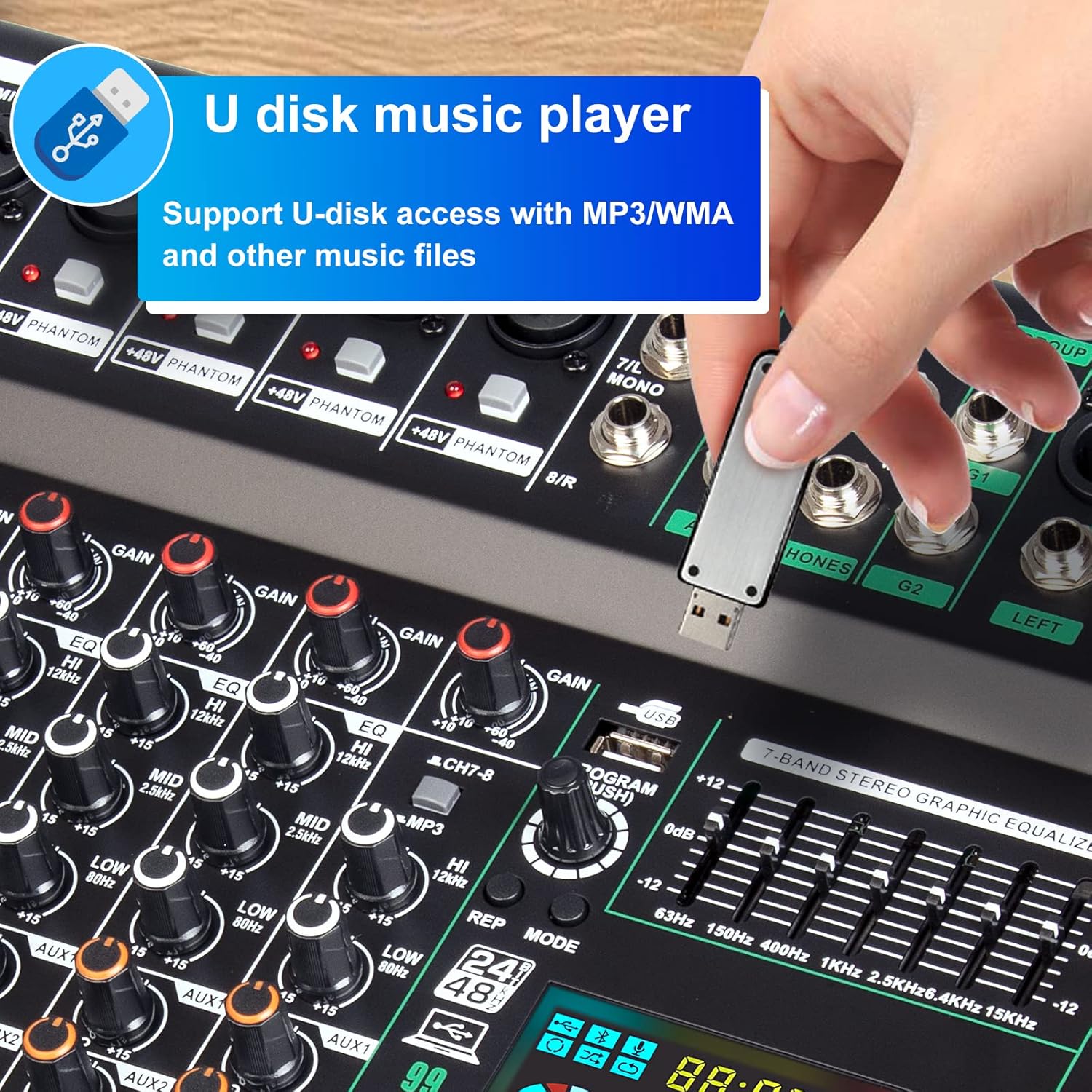 - Independent double group output interface, 7-band equalizer, modify music and vocals for detailed processing, and create professional tuning