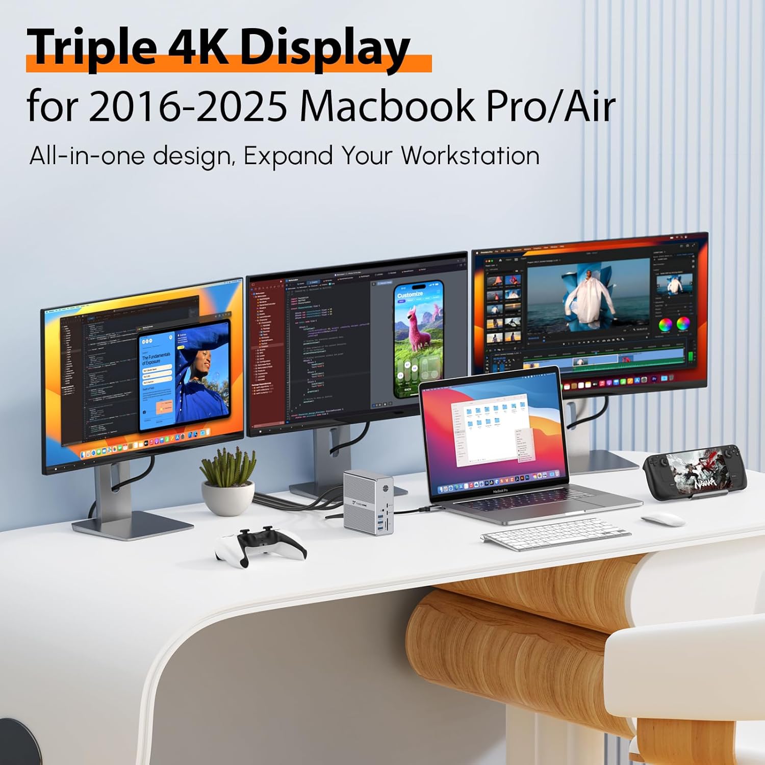 - Triple/Quad 4K Extended Display: Featuring 3x HDMI and 3x DP, this docking station allows you to enjoy various display combinations(HDMI, DP, or a mix) to effortlessly extend your laptop to triple/quad 4K@60Hz monitors, providing an unparalleled visual experience. Note: For Windows, it support up to 4 monitors if laptop's USB-C port support video output, otherwise only 2 monitors. For macOS, it ONLY support 3 monitors, because HDMI 3 and DP 3 cannot be used simultaneously.Not for HULU/Netflix
