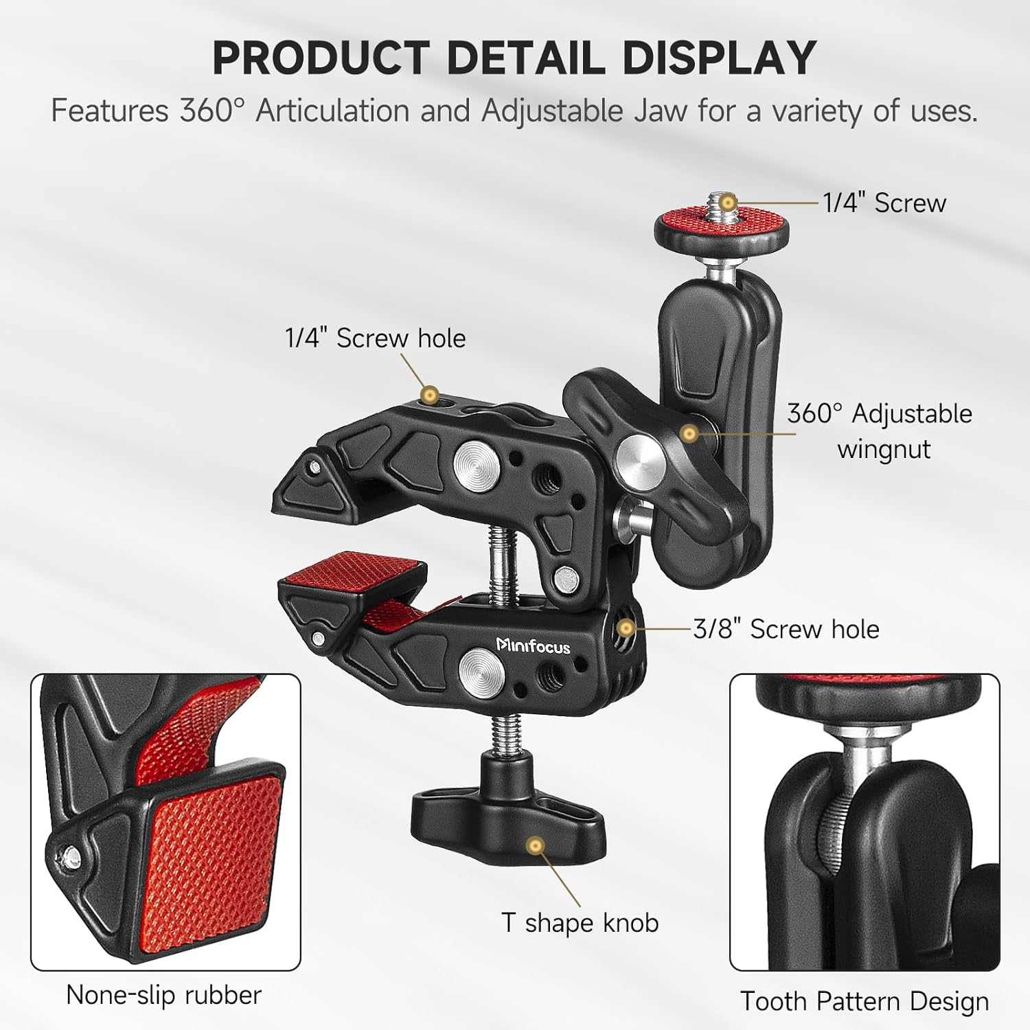 MINIFOCUS Super Clamp Camera Clamp Mount, 360° Ballhead Magic Arm with 1/4" 3/8" Port Extension Holder Adapter, Double Ball Head Adapter for Canon Nikon DSLR GoPro Action Camera Video Light
