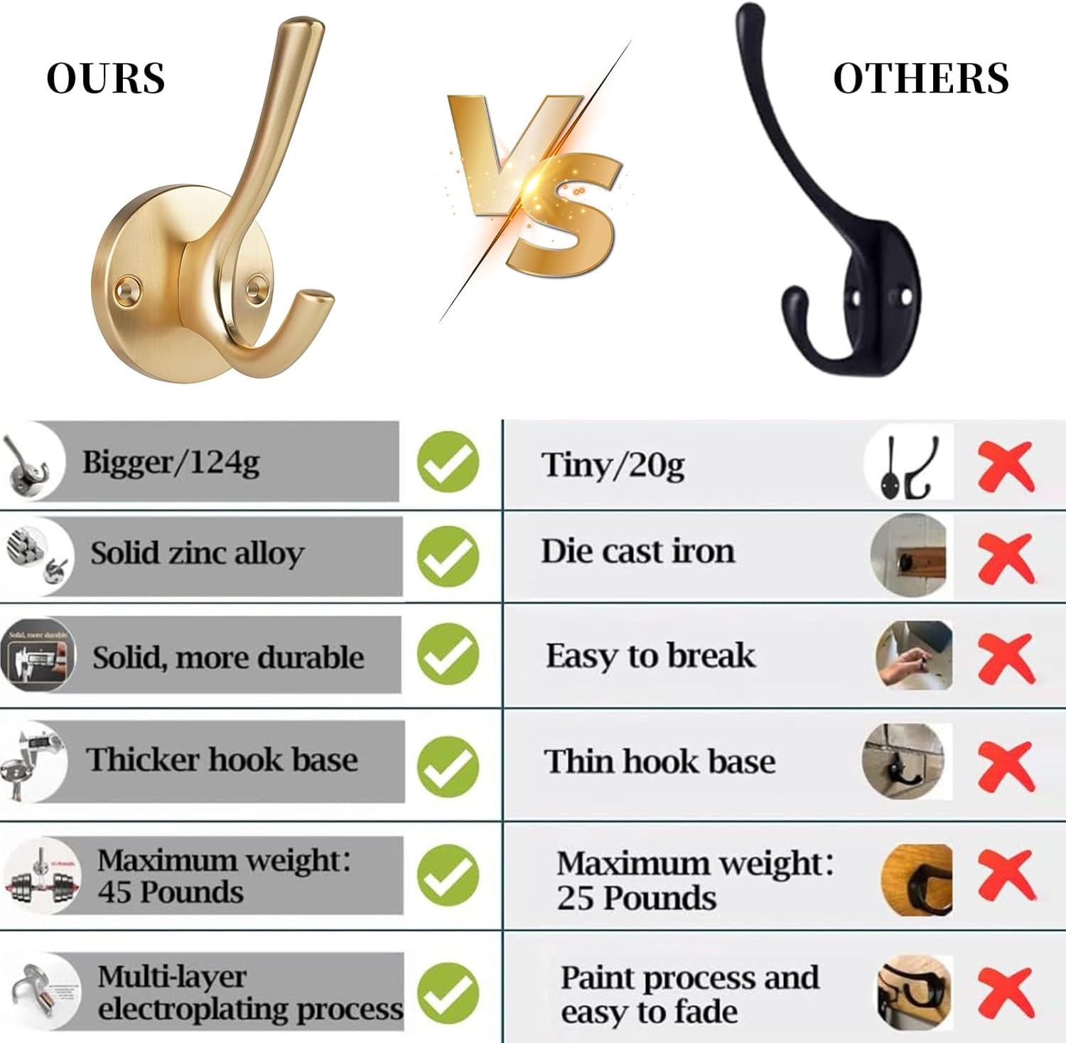 - Sturdy and Durable: Our coat hooks are made with a thickened solid zinc alloy base, making them strong and durable enough to hold up to 45lbs.