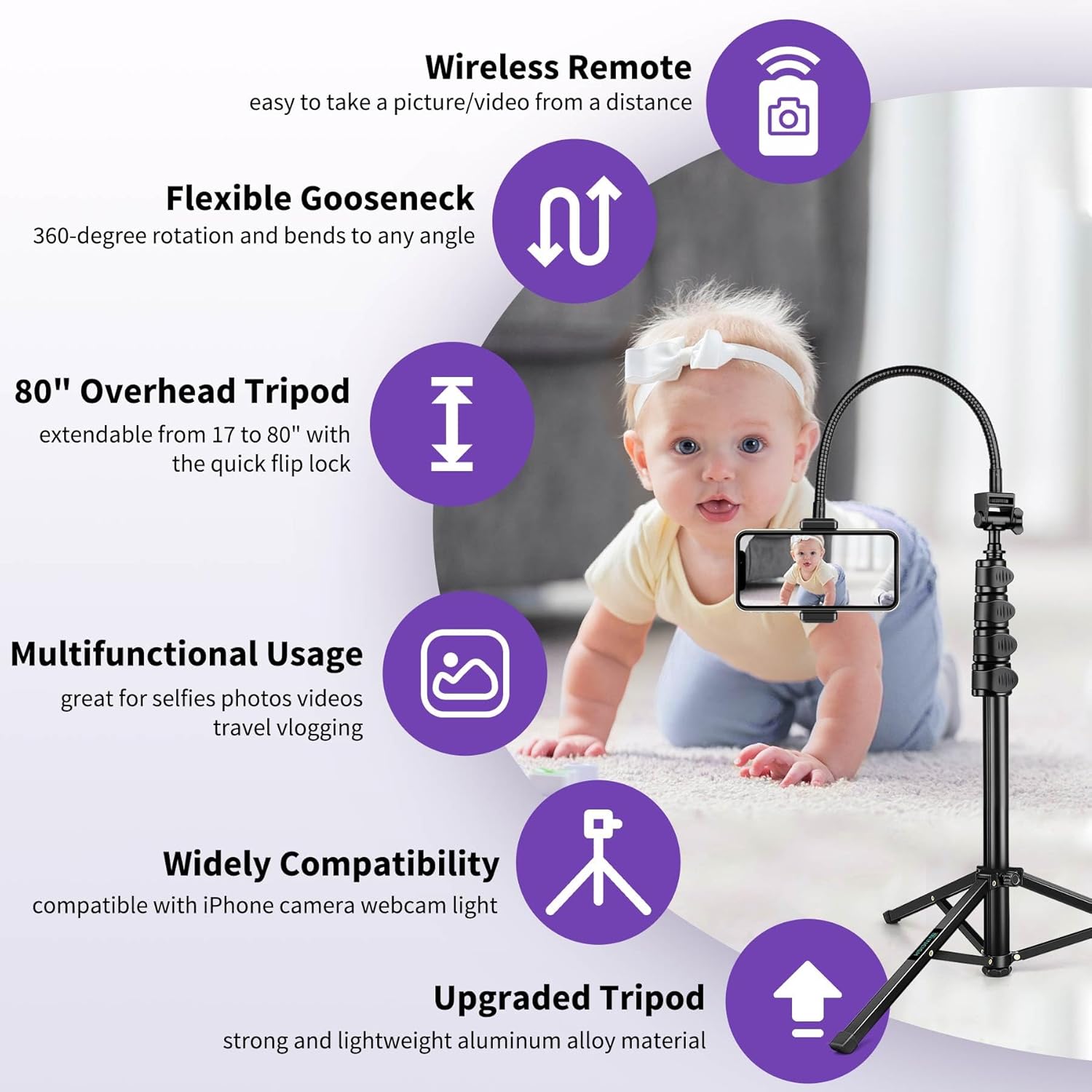 - 80" Tall Travel Tripod: With a long flexible gooseneck and phone holder, the tripod stand compatible with iPhone 14 13 12 11 Pro/XS/XR/MAX/8/8 Plus/X/7 Plus/7/6s Plus/6s/6 Plus/6, Samsung Galaxy , and Android smartphones. Standard 1/4" screw mount tripod for DSLR, action camera, webcam, project, and digital camera. You can rotate and select horizontal or vertical camera mode, including 360 ̊ panoramic shooting, landscape mode, portrait mode, low angle shot, and high angle shot.