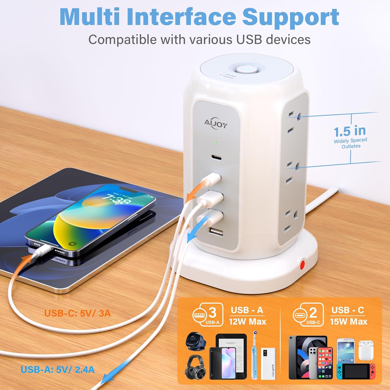 AiJoy Flat Plug Power Strip Tower with 9 Outlets and 5 USB Ports (2 USB-C), 1200J Surge Protection, 1625W Extension Cord with Multiple Outlets Charging Station for Home Dorm Office Supplies
