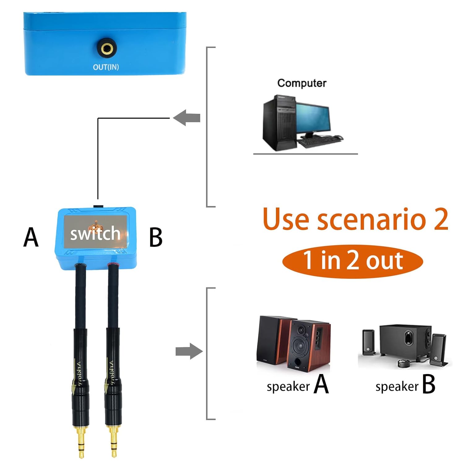 5ft Sound Channel swicher 1/8" aux Input 3.5mm Female to 2X 3.5 Output Switch Selector 2 in 1 Out R/L Stereo Audio 1 in 2 Out Stereo Audio Splitter with Phone pc Player