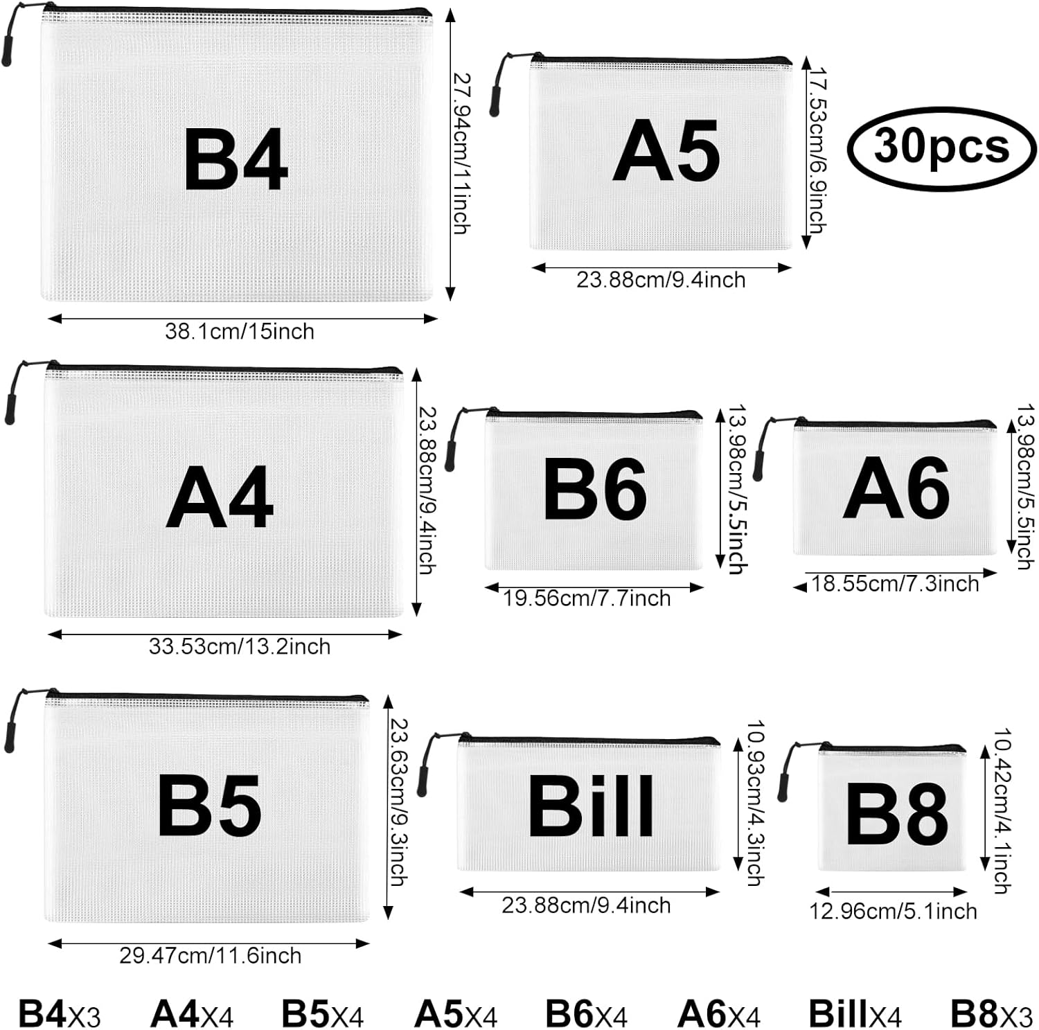 - What You Will Get: 30pcs zipper organizer bags. 3*B4 (14.9*11 inches), 4*A4 (13.1*9.4 inches), 4*B5 (11.6*8.2 inches), 4*A5 (9.4*6.8 inches), 4*B6 (7.6*5.5 inches), 4*A6 (7.2*4.5 inches), 4*Bills (9*4.3 inches), 3*B8 (5.1*4.5 inches),come with small colored stickers to mark the contents and help you easily keep track of the items inside
