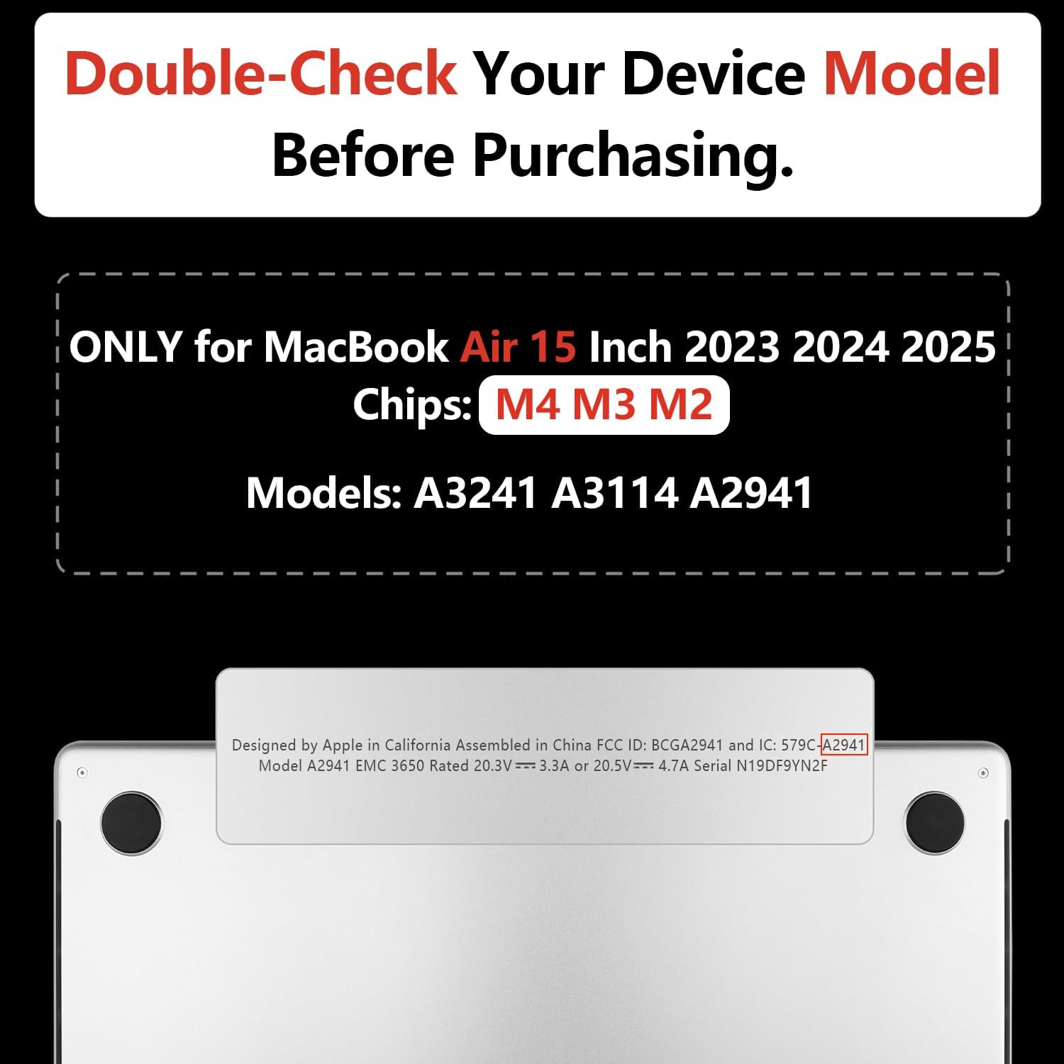 - For latest MacBook Air 15 inch Case - Only compatible with MacBook Air 15 inch 2025 2024 2023 Release Model A3241 with M4 Chip or A3114 with M3 Chip or A2941 with M2 Chip. Please check the device model before purchasing