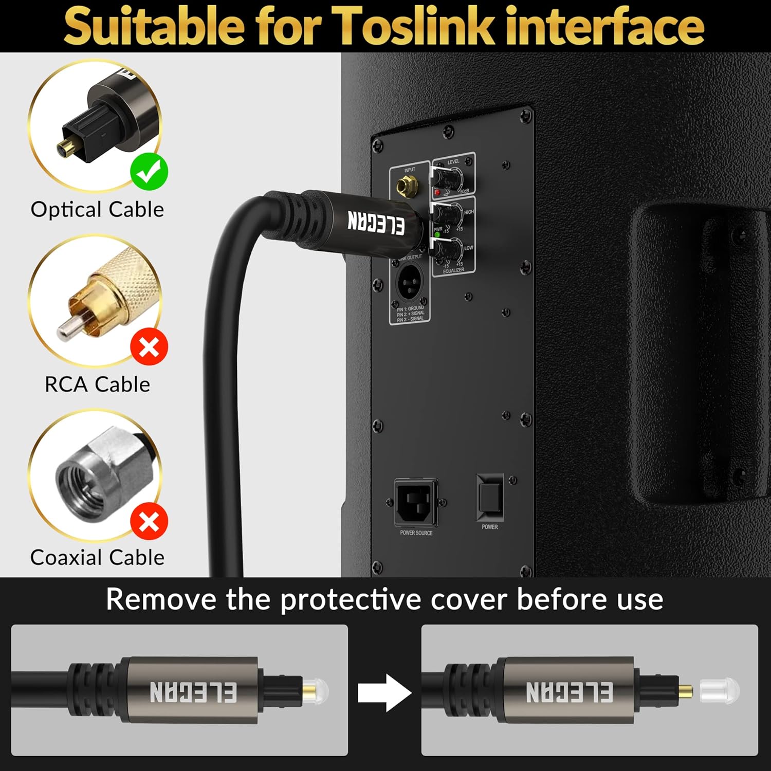 - 【Excellent Sound Quality】: Elecan digital optical audio cable adopts Japan Toray Original Fiber Core for zero distortion Lossless Audio. This Toslink cable is compatible with uncompressed PCM audio and compressed 5.1 to 7.1 surround sound systems including Dolby Digital Plus, DTS-HD High Resolution and LPCM. Perfect and crystal-clear digital audio for DVDs, Blu-rays, home theater systems, receivers, satellite TV, online streaming, PlayStation 4 & Xbox One gaming systems