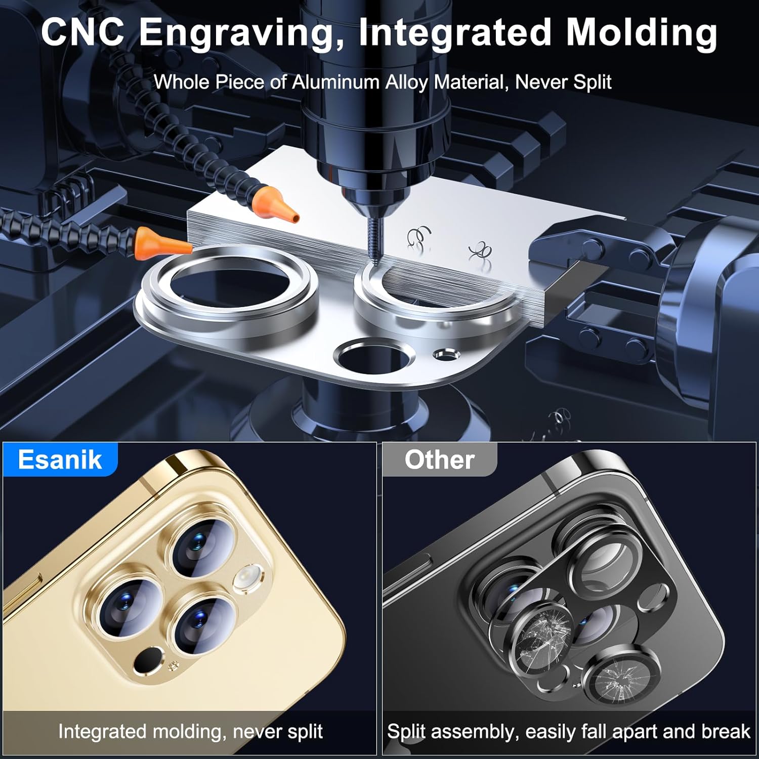 - 【CNC Engraving & Integrated Molding】 Esanik 2023 Upgrade Version iPhone 14 pro max / iPhone 14 Pro Cam Cover is precisely carved from whole piece of high-quality aluminum alloy, firm and long lasting. Bid farewell to the split and falling apart issues resulting from the conventional split assembly process.
