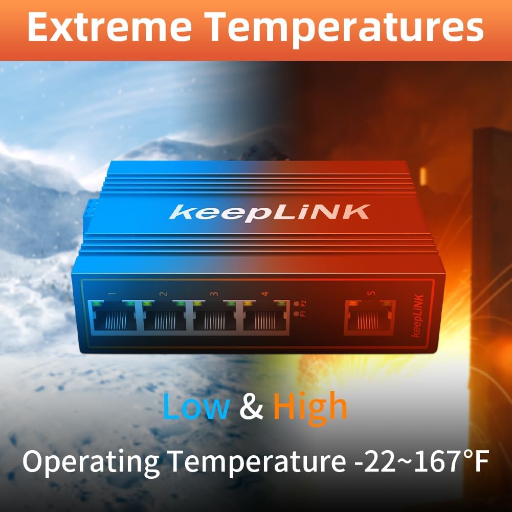 - Extreme temperature Switch: the metal hardened IP40 rated network switch is equipped with a rugged IP40 rated enclosure and designed to withstand a high degree of vibration, shock, while operating with a wide temperature range (-30 ~ 75 °C (-22 ~ 167 °F) For harsh environments.