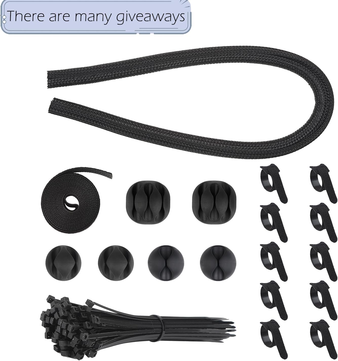 - What you get – what you need to organize your wires and cable is all in one. You will get: 1* cable manage box, 10* cable ties, 100* Self lock wire ties, 6*Cable clip holders (3 styles), 1*150cm*1.5cm/4.92ft*0.049ft(L*W) self adhesive cable tie rolls, 1*50cm*1.3cm/1.64ft*0.043ft(L*W) flexible woven cable management wraps.