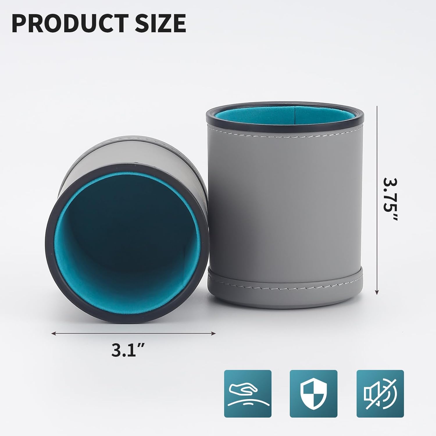 - STURDY DICE CUP - Grey Leather exterior with turquoise felt- lined interior. It is 3 1/2 inches deep and about 3.1 inches across.It has straight walls rather than a tapered out style.
