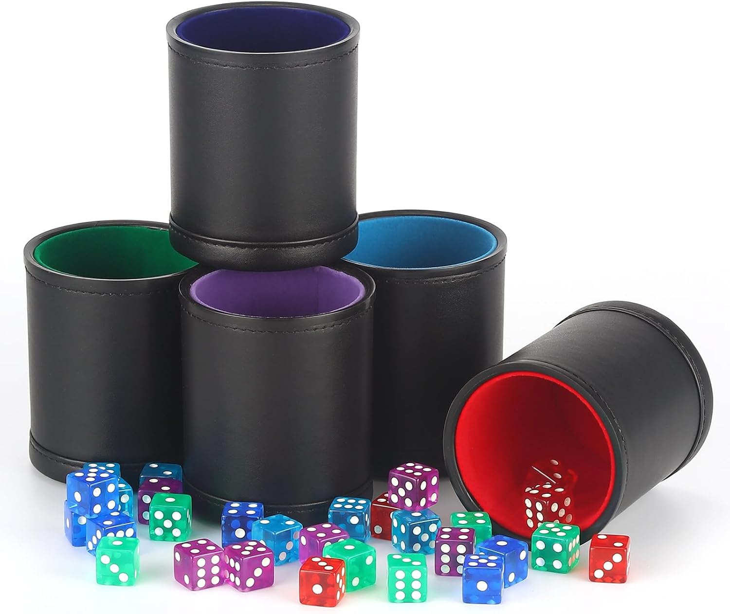 - Package contains 5 pack with different color felt lined dice cups and 30 matching colorful transparent standard 16mm dot dice.