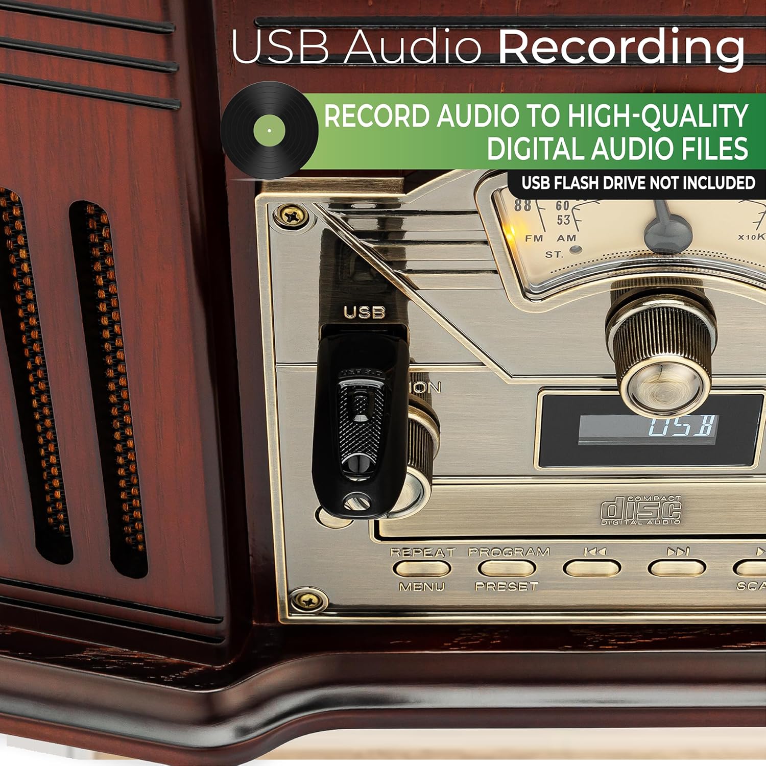 - 7-in-1 Turntable: Record Player (33/45/78 RPM), Bluetooth, CD Player, Cassette Tape Player, AM/FM Radio, 3.5mm Aux In & Headphone Jack, USB Playback, USB Recording to Digital Audio File (USB Flash Drive Not Included)