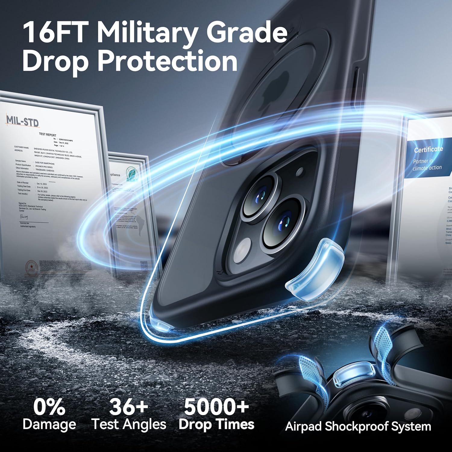 - [16FT Military Grade Protection] Based on 5000+ extreme drop resistance tests, the MagicStand case's durability and sturdiness surpass most ordinary phone cases. It passed the Military Grade test by the (MIL-STD-810H 516.8). The shockproof polycarbonate back and airpad cushioning enhance protection against daily drops and bumps. A 2.5mm raised camera border prevents lens scratches, while a 1.24mm bezel safeguards your screen