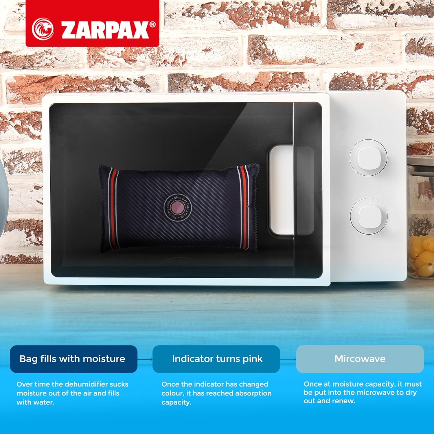 - DIRECTIONS OF USE An intelligent design, ZARPAX's dehumidifier bags are incredibly easy to use. Once placed in the desired vehicle or boat, the water-retaining dehumidifier fills with moisture present in the air. The humidity indicator will then slowly change from blue to pink. Once the indicator has changed colour, it has reached absorption capacity & must be put into the microwave (2x6 minutes).