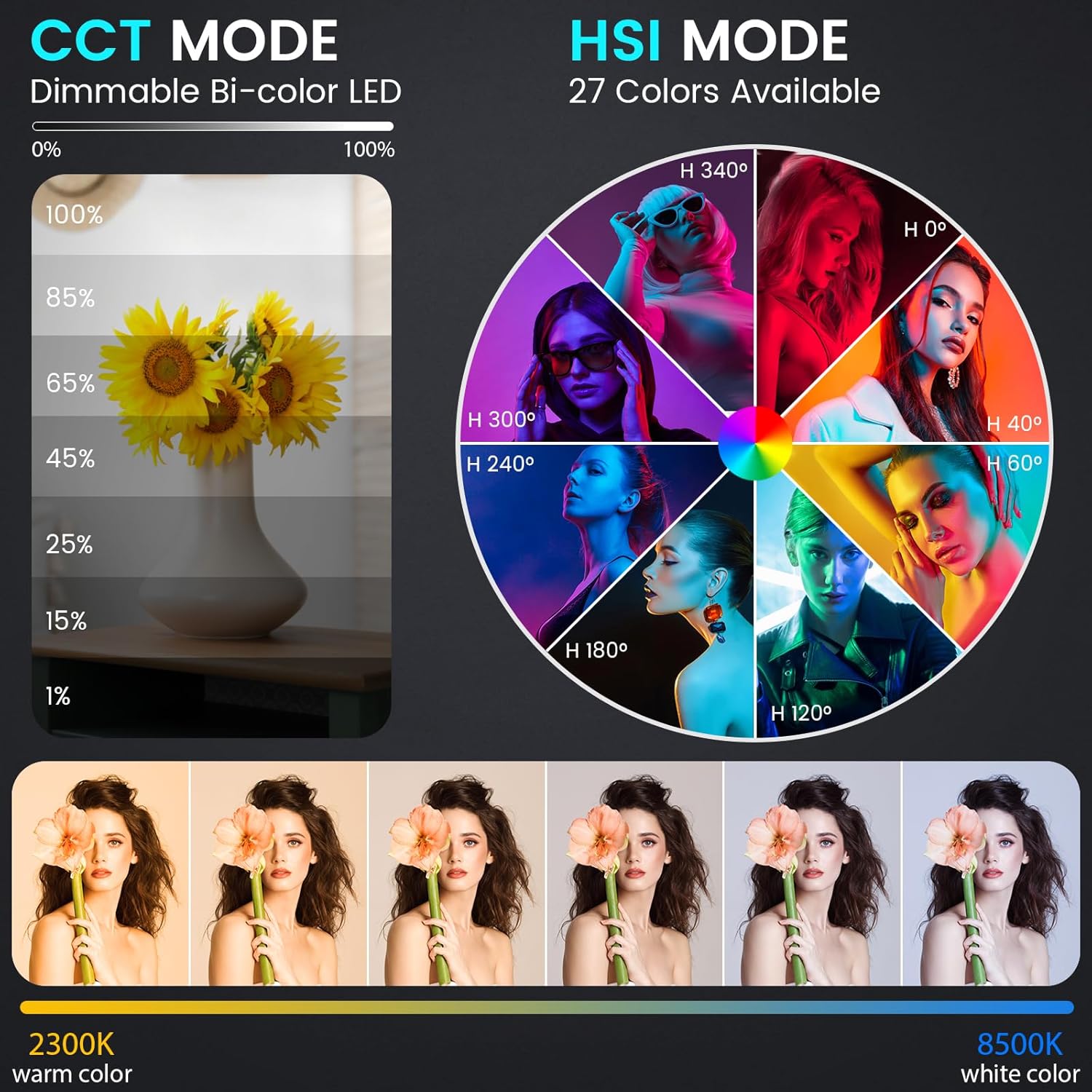 2-Pack RGB Photography Lighting Kit, 50W Bi-Color Professional LED Studio Lights, 2300k~8500k Dimmable Photo Lights for Photography Filming Camera Video Recording Stage Shooting Streaming TikTok